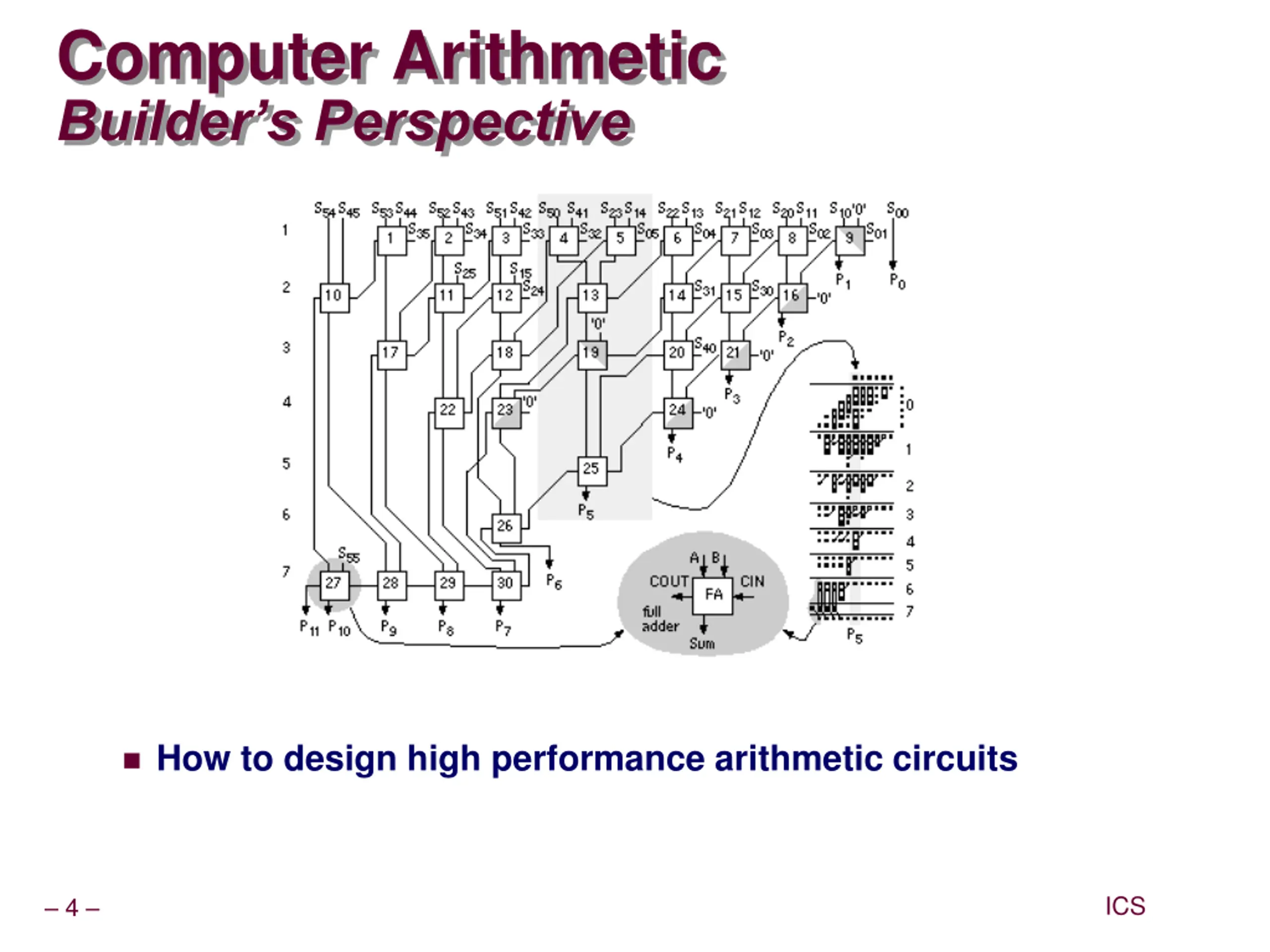 Computer Arithmetic Builder s Perspective 32-bit Multiplier How to design high performance arithmetic circuits ICS 4