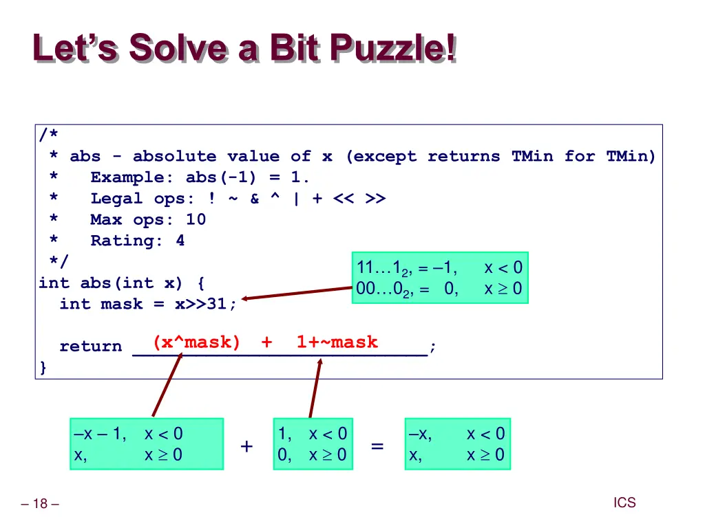 Lets Solve a Bit Puzzle! /* * abs - absolute value of x (except returns TMin for TMin) * Example: abs(-1) = 1. * Legal ops: ! ~ & ^ | + << >> * Max ops: 10 * Rating: 4 */ int abs(int x) { int mask = x>>31; 11 12, = 1, 00 02, = 0, x < 0 x 0 (x^mask) + 1+~mask return ____________________________; } x 1, x < 0 x, 1, x < 0 0, x 0 x, x, x < 0 x 0 + = x 0 ICS 18