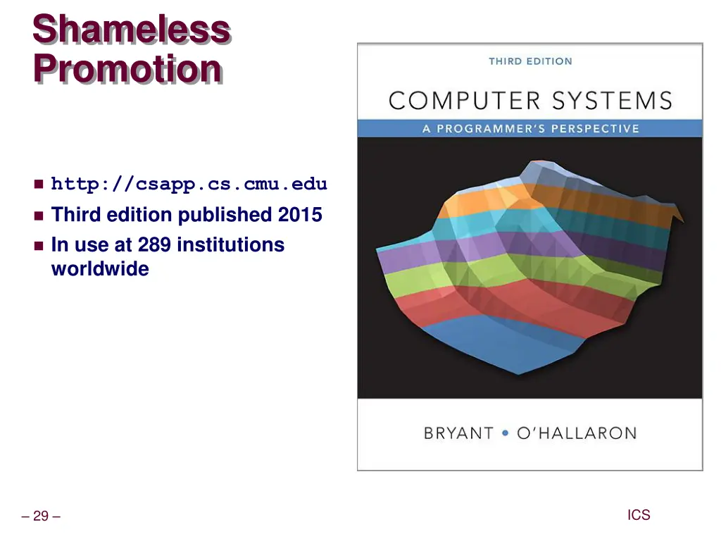 Shameless Promotion http://csapp.cs.cmu.edu Third edition published 2015 In use at 289 institutions worldwide ICS 29