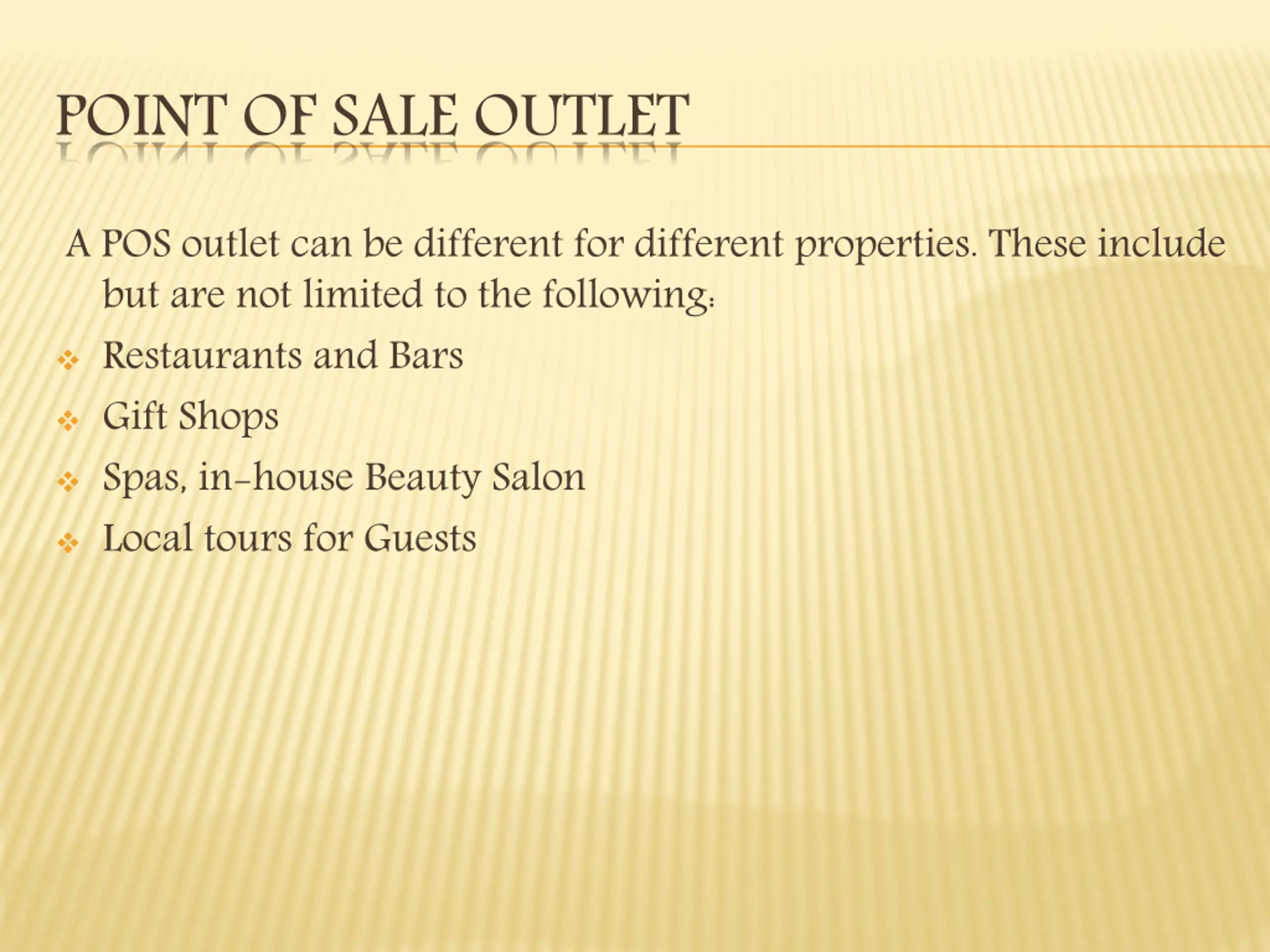 POINT OF SALE OUTLET A POS outlet can be different for different properties. These include but are not limited to the following: Restaurants and Bars Gift Shops Spas, in-house Beauty Salon Local tours for Guests