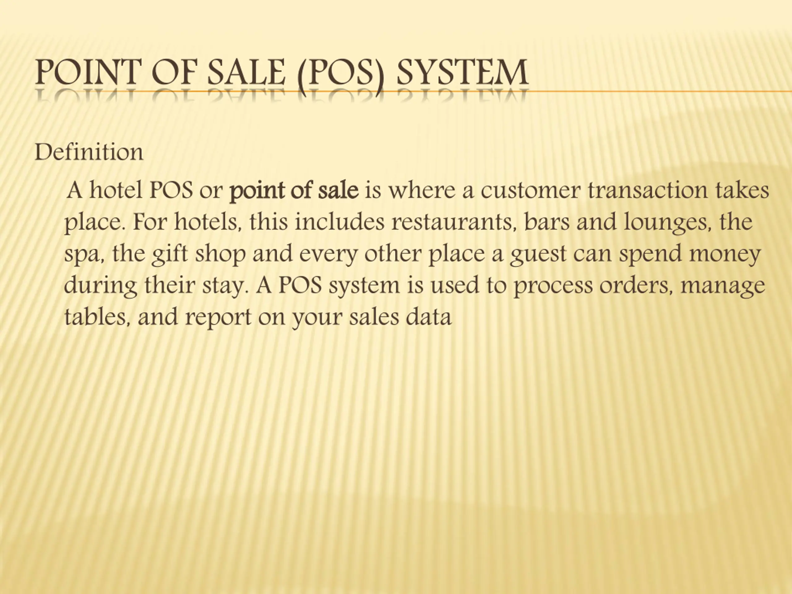 POINT OF SALE (POS) SYSTEM Definition A hotel POS or point of sale place. For hotels, this includes restaurants, bars and lounges, the spa, the gift shop and every other place a guest can spend money during their stay. A POS system is used to process orders, manage tables, and report on your sales data point of sale is where a customer transaction takes
