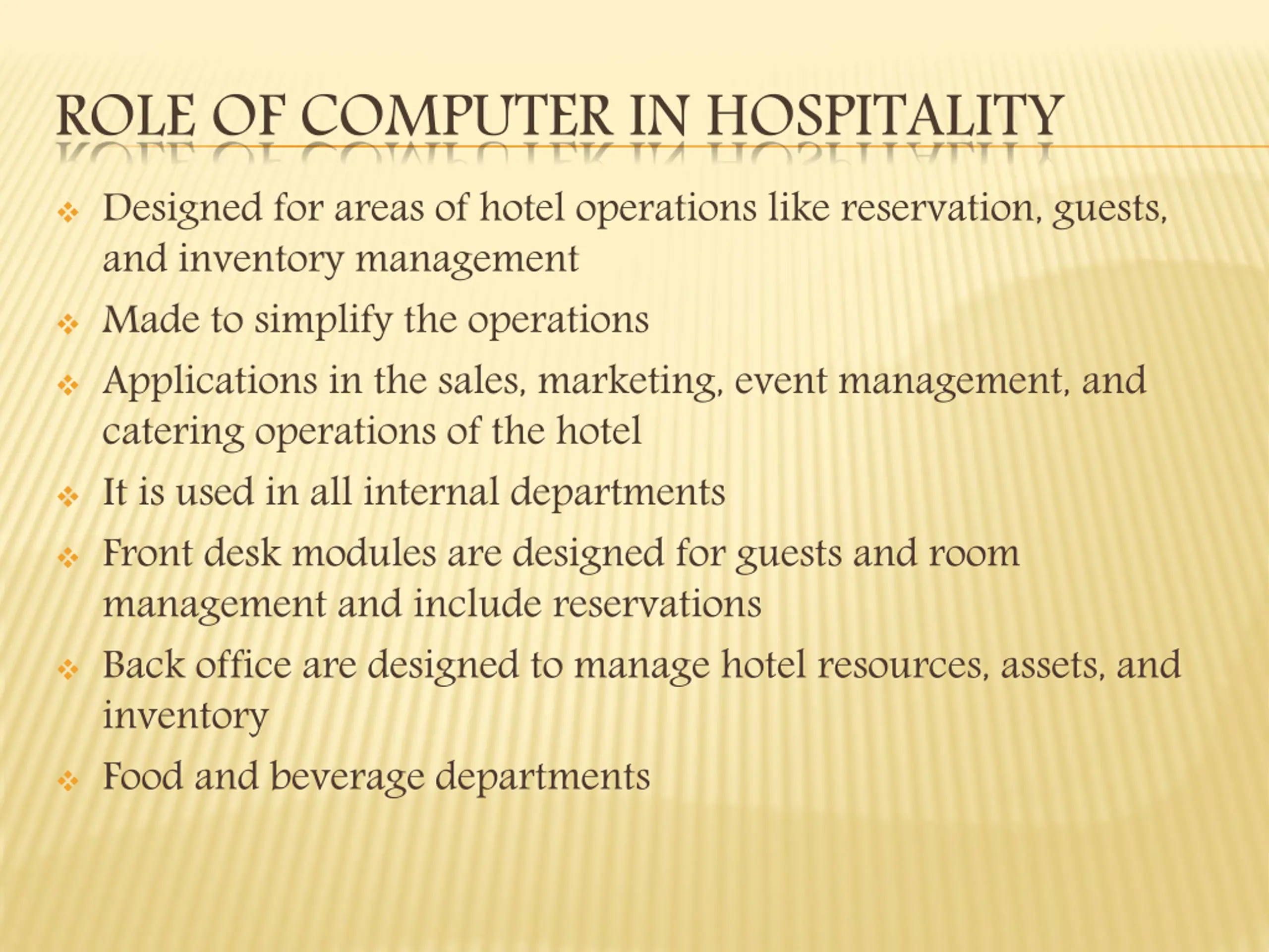 ROLE OF COMPUTER IN HOSPITALITY Designed for areas of hotel operations like reservation, guests, and inventory management Made to simplify the operations Applications in the sales, marketing, event management, and catering operations of the hotel It is used in all internal departments Front desk modules are designed for guests and room management and include reservations Back office are designed to manage hotel resources, assets, and inventory Food and beverage departments