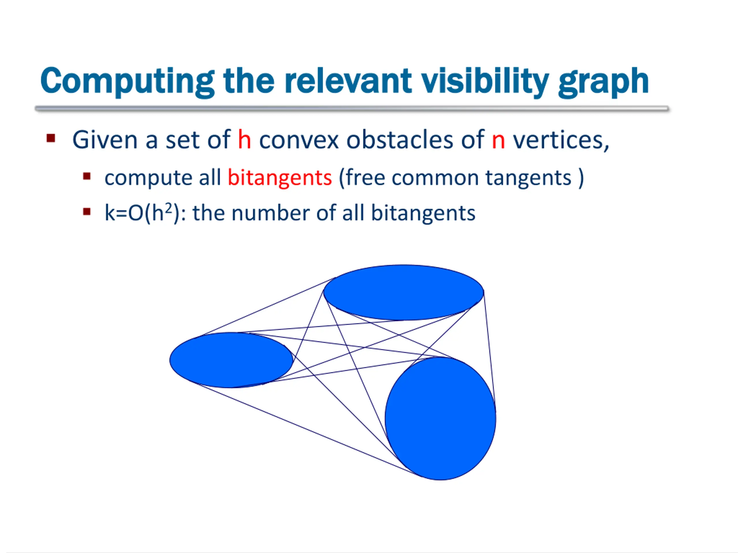 Computing the relevant visibility graph Computing the relevant visibility graph Given a set of h convex obstacles of n vertices, compute all bitangents (free common tangents ) k=O(h2): the number of all bitangents