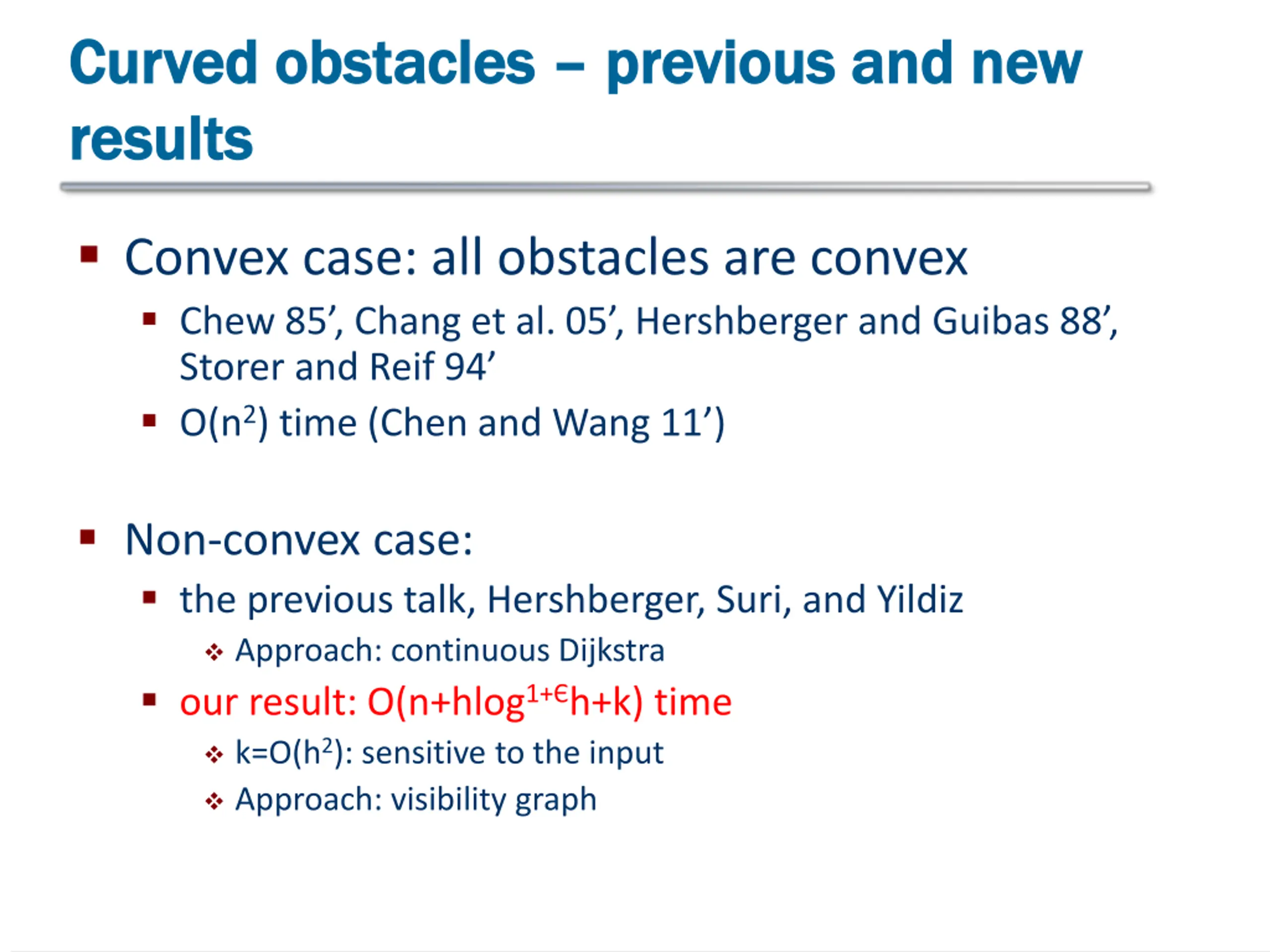 Curved obstacles Curved obstacles previous and new results results previous and new Convex case: all obstacles are convex Chew 85 , Chang et al. 05 , Hershberger and Guibas 88 , Storer and Reif 94 O(n2) time (Chen and Wang 11 ) Non-convex case: the previous talk, Hershberger, Suri, and Yildiz Approach: continuous Dijkstra our result: O(n+hlog1+ h+k) time k=O(h2): sensitive to the input Approach: visibility graph