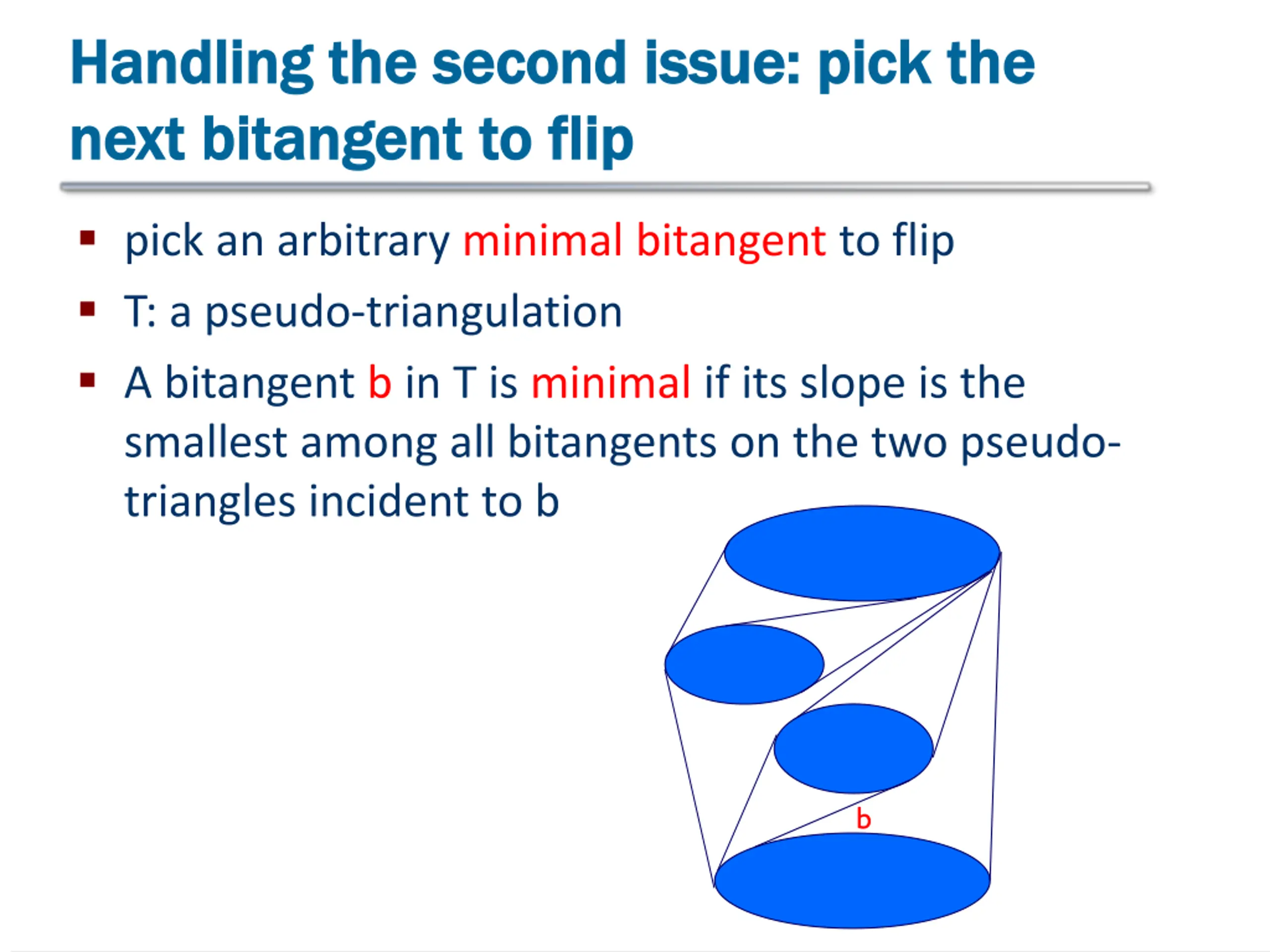 Handling the second issue: pick the Handling the second issue: pick the next next bitangent bitangent to flip to flip pick an arbitrary minimal bitangent to flip T: a pseudo-triangulation A bitangent b in T is minimal if its slope is the smallest among all bitangents on the two pseudo- triangles incident to b b