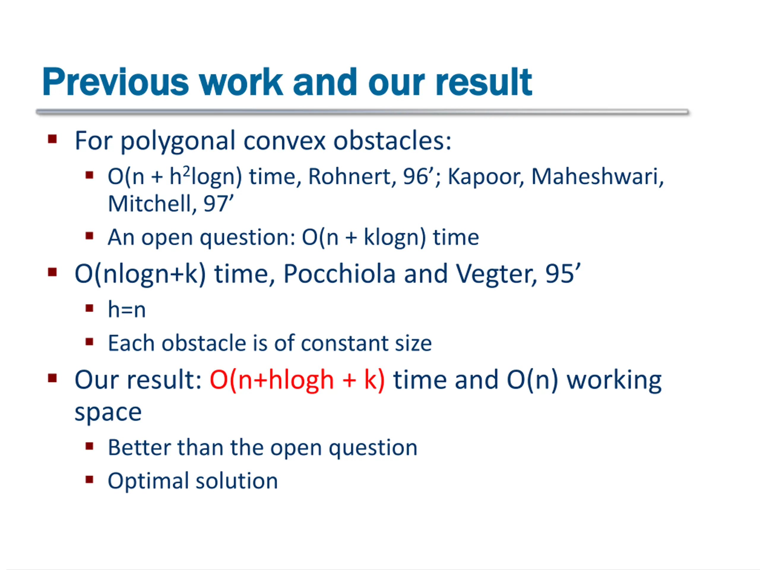 Previous work and our result Previous work and our result For polygonal convex obstacles: O(n + h2logn) time, Rohnert, 96 ; Kapoor, Maheshwari, Mitchell, 97 An open question: O(n + klogn) time O(nlogn+k) time, Pocchiola and Vegter, 95 h=n Each obstacle is of constant size Our result: O(n+hlogh + k) time and O(n) working space Better than the open question Optimal solution