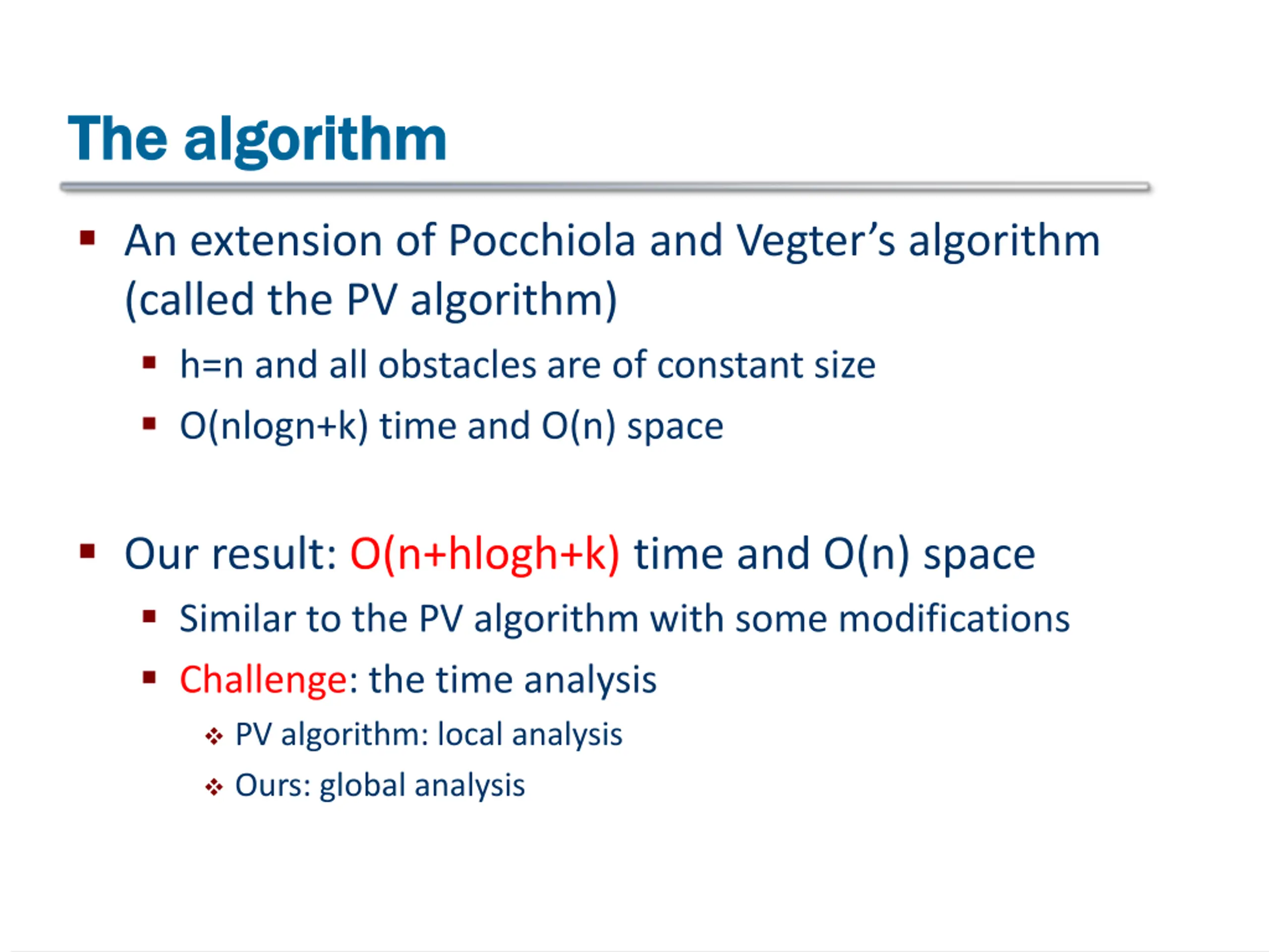 The algorithm The algorithm An extension of Pocchiola and Vegter s algorithm (called the PV algorithm) h=n and all obstacles are of constant size O(nlogn+k) time and O(n) space Our result: O(n+hlogh+k) time and O(n) space Similar to the PV algorithm with some modifications Challenge: the time analysis PV algorithm: local analysis Ours: global analysis