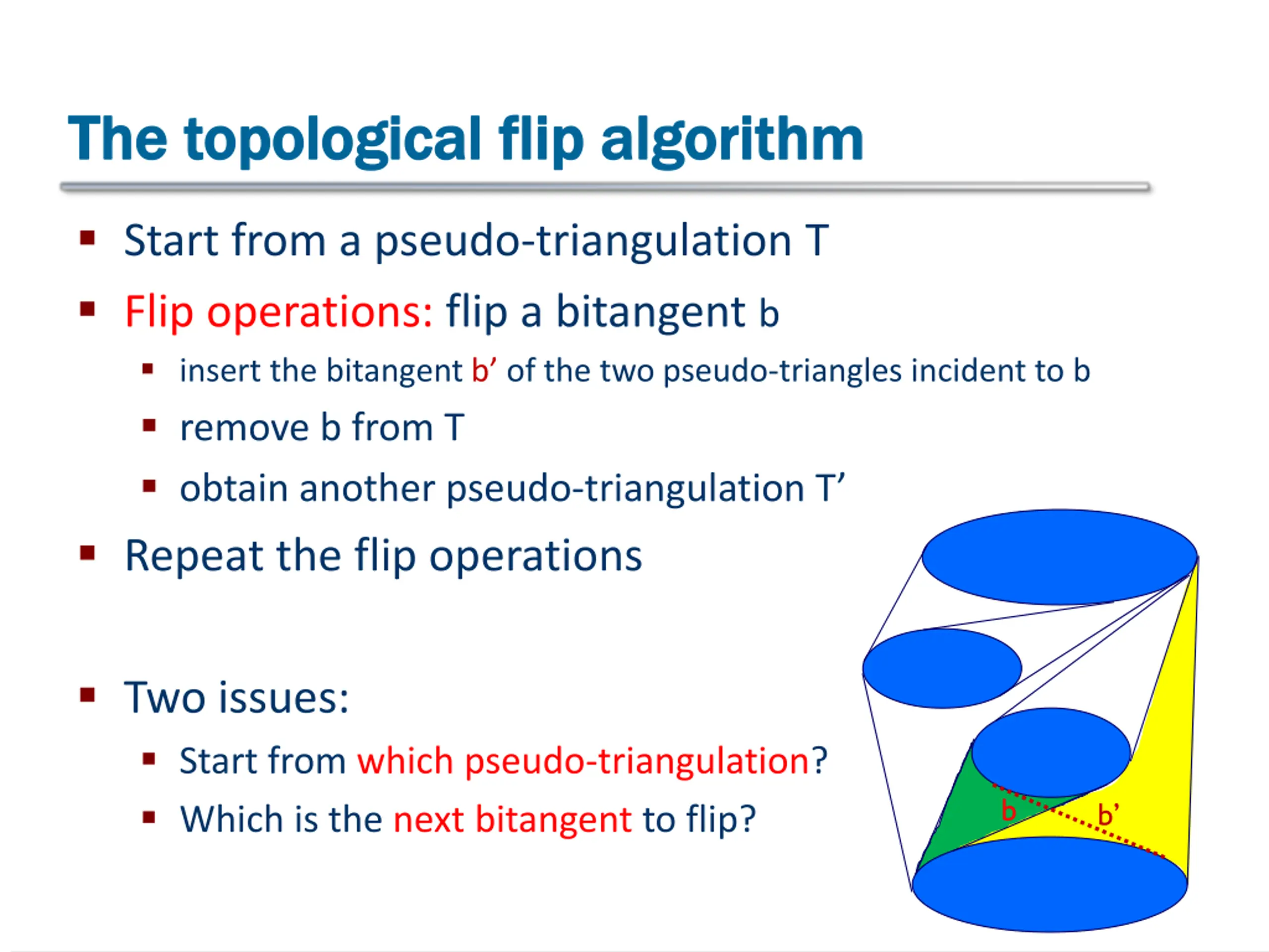 The topological flip algorithm The topological flip algorithm Start from a pseudo-triangulation T Flip operations: flip a bitangent b insert the bitangent b of the two pseudo-triangles incident to b remove b from T obtain another pseudo-triangulation T Repeat the flip operations Two issues: Start from which pseudo-triangulation? Which is the next bitangent to flip? b b