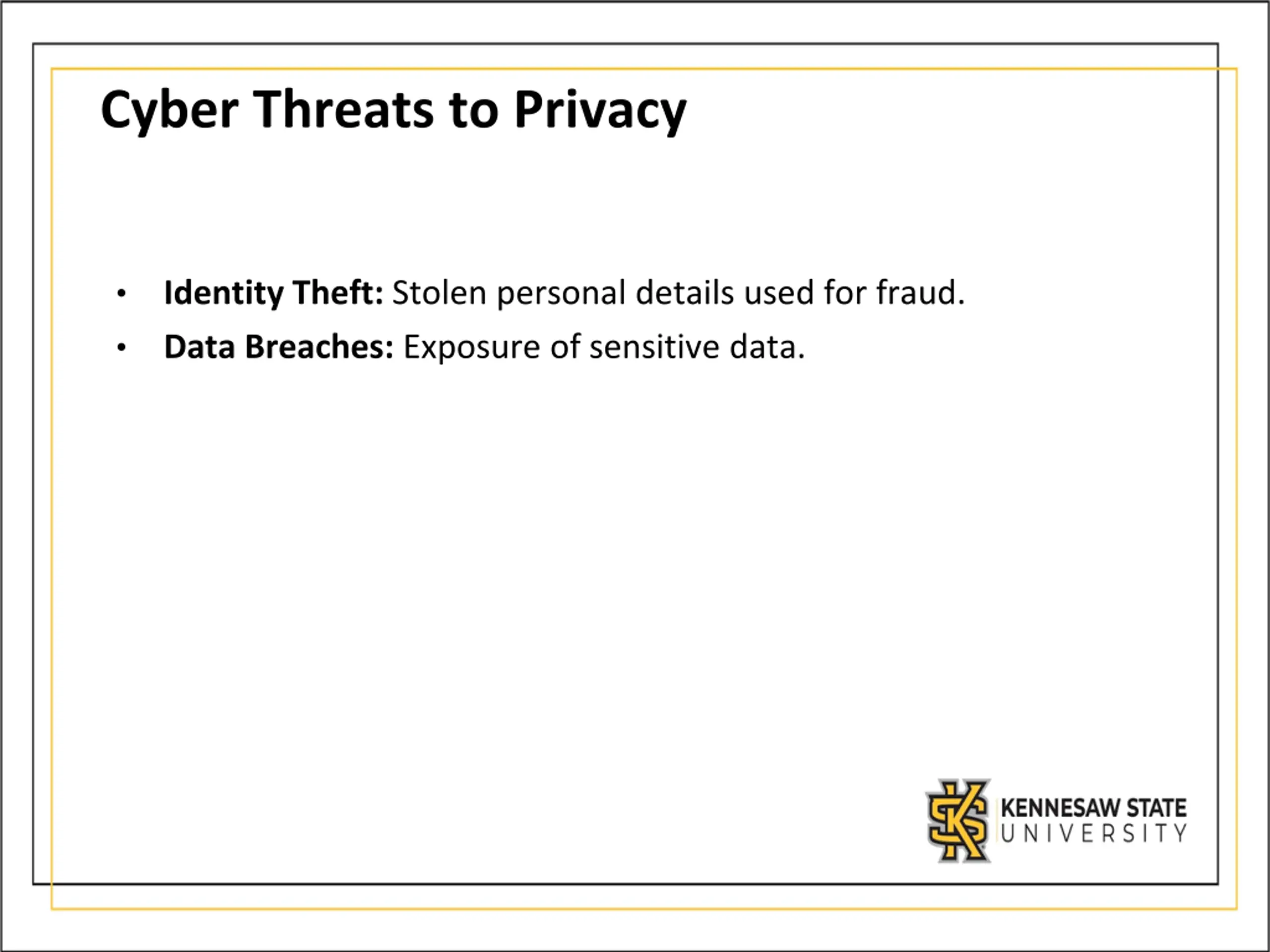 Cyber Threats to Privacy Identity Theft: Stolen personal details used for fraud. Data Breaches: Exposure of sensitive data.