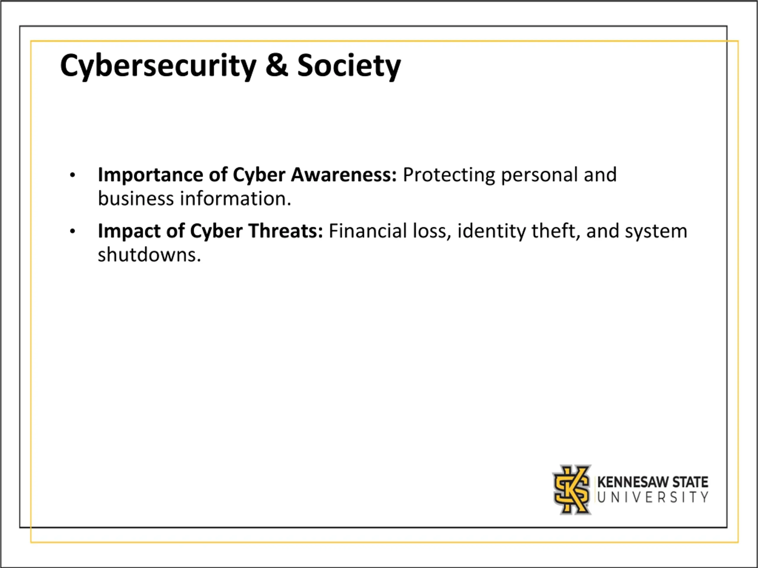 Cybersecurity & Society Importance of Cyber Awareness: Protecting personal and business information. Impact of Cyber Threats: Financial loss, identity theft, and system shutdowns.