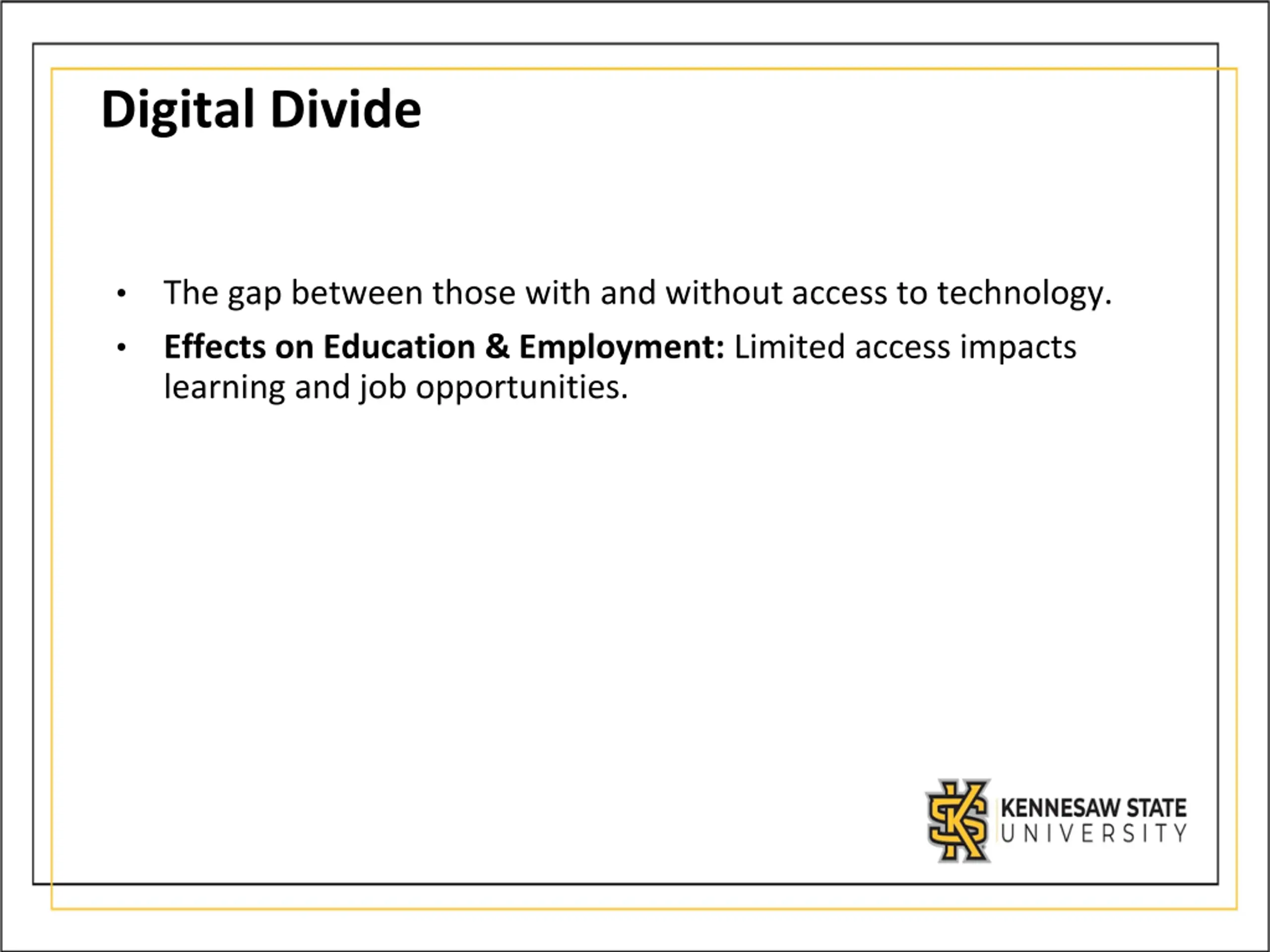 Digital Divide The gap between those with and without access to technology. Effects on Education & Employment: Limited access impacts learning and job opportunities.