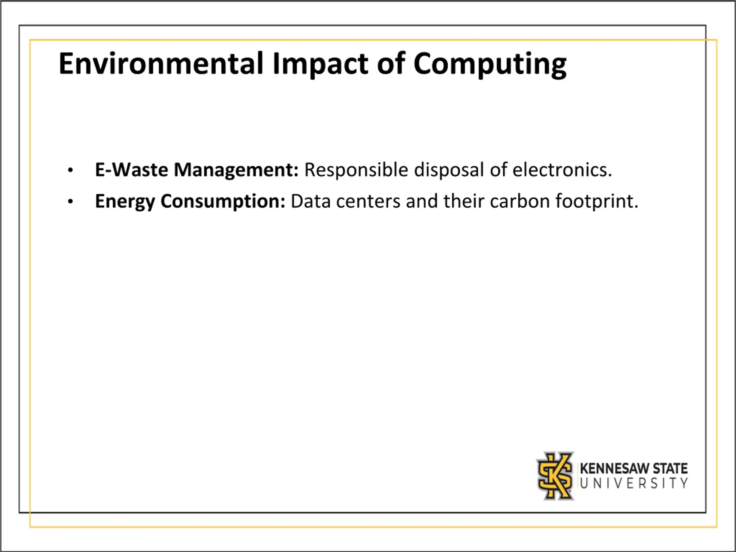Environmental Impact of Computing E-Waste Management: Responsible disposal of electronics. Energy Consumption: Data centers and their carbon footprint.