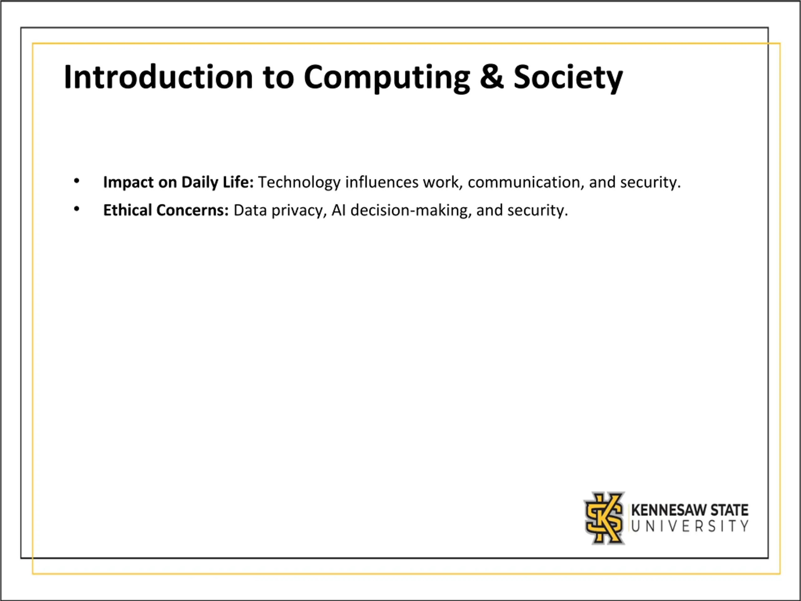 Introduction to Computing & Society Impact on Daily Life: Technology influences work, communication, and security. Ethical Concerns: Data privacy, AI decision-making, and security.