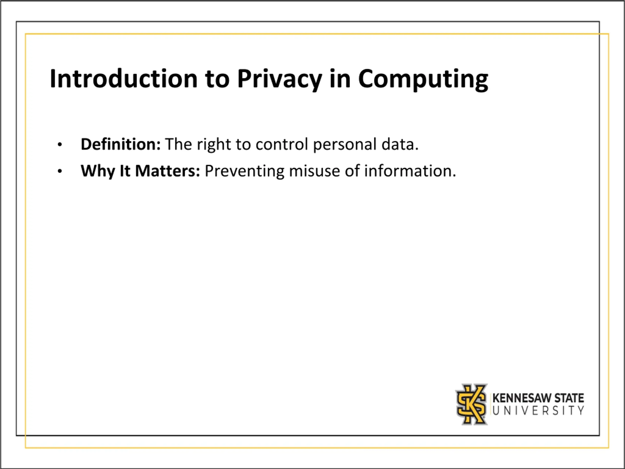Introduction to Privacy in Computing Definition: The right to control personal data. Why It Matters: Preventing misuse of information.