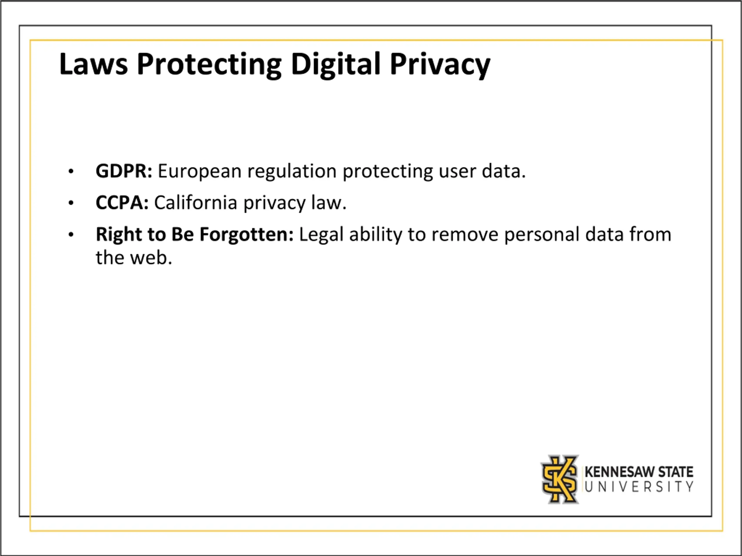 Laws Protecting Digital Privacy GDPR: European regulation protecting user data. CCPA: California privacy law. Right to Be Forgotten: Legal ability to remove personal data from the web.