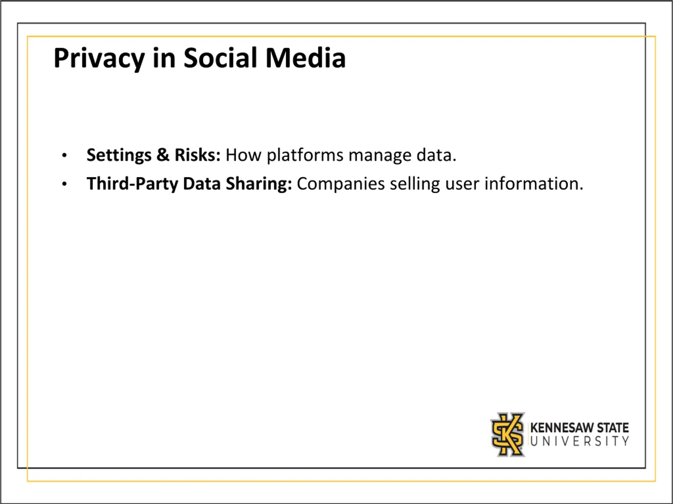 Privacy in Social Media Settings & Risks: How platforms manage data. Third-Party Data Sharing: Companies selling user information.