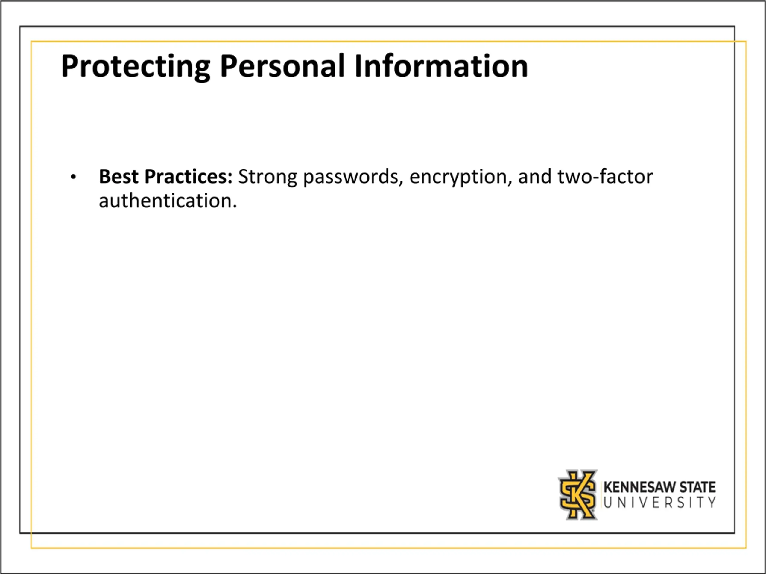 Protecting Personal Information Best Practices: Strong passwords, encryption, and two-factor authentication.