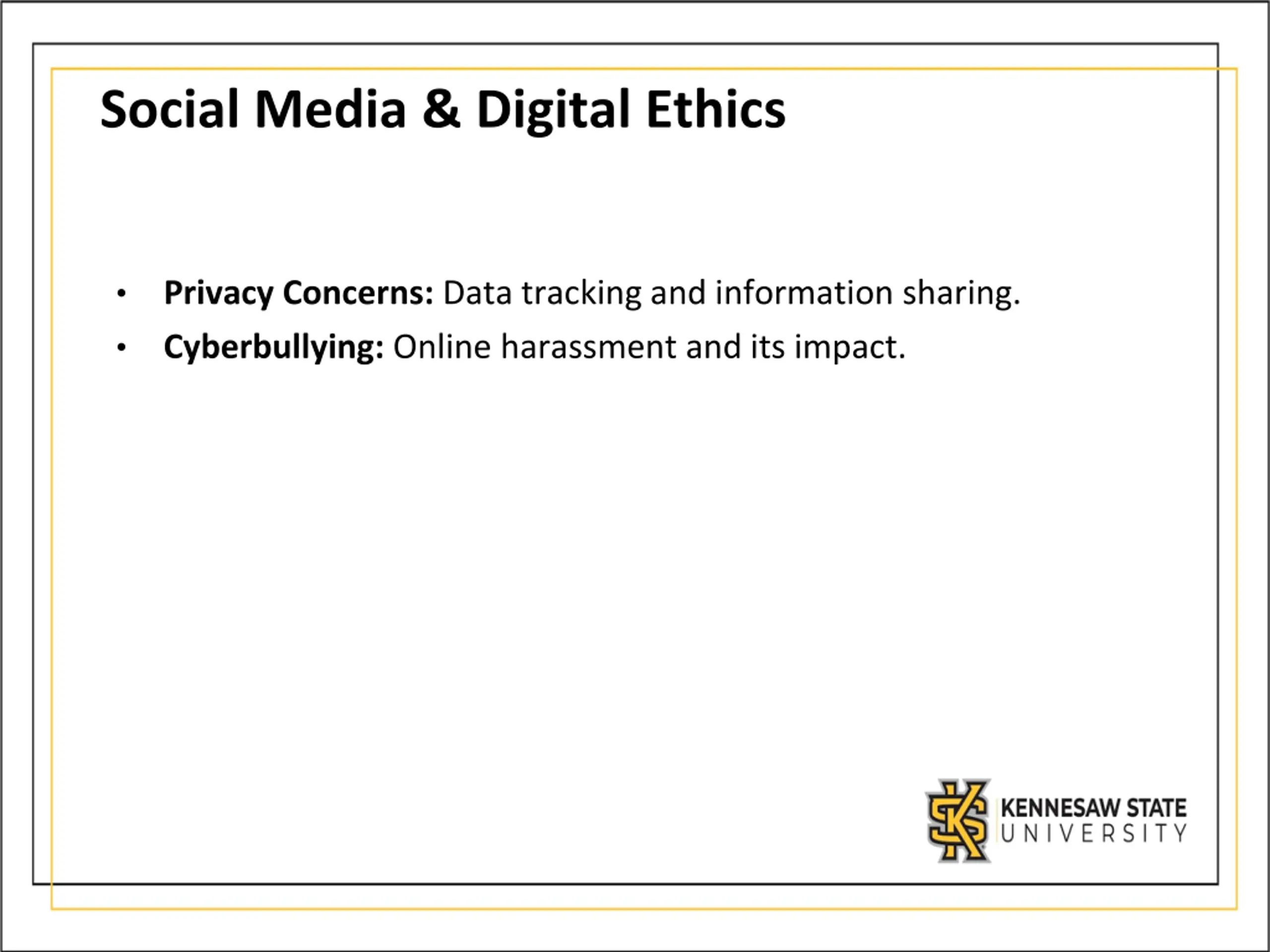 Social Media & Digital Ethics Privacy Concerns: Data tracking and information sharing. Cyberbullying: Online harassment and its impact.