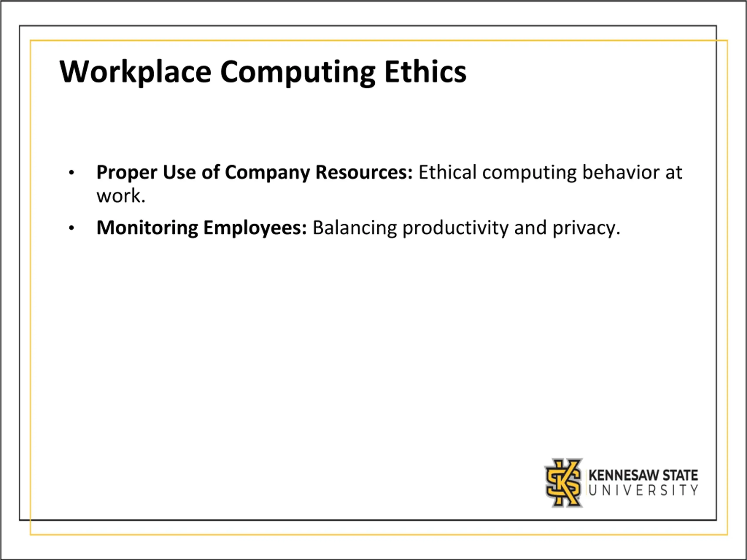 Workplace Computing Ethics Proper Use of Company Resources: Ethical computing behavior at work. Monitoring Employees: Balancing productivity and privacy.