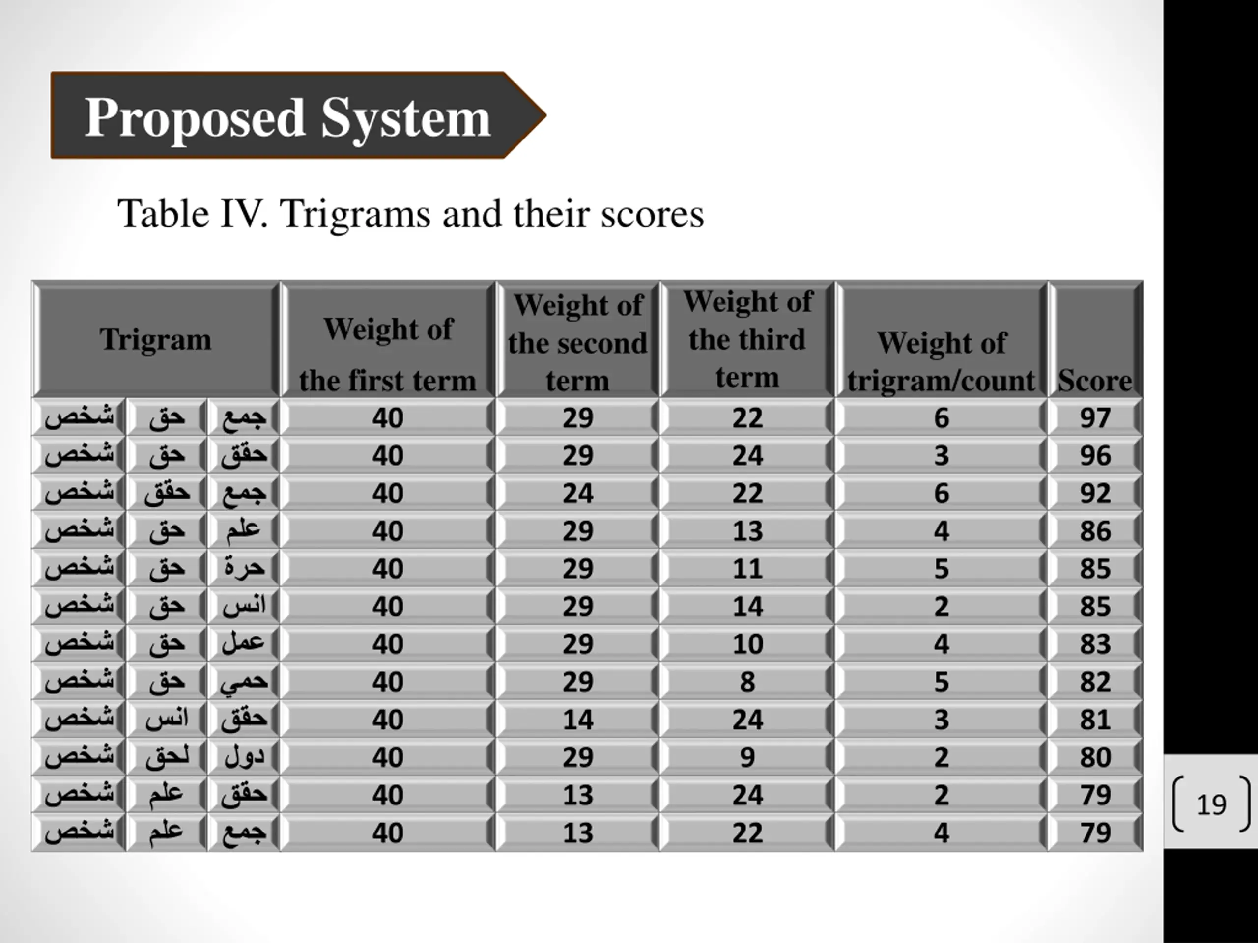 Proposed System Table IV. Trigrams and their scores Weight of the third term 22 24 22 13 11 14 10 8 24 9 24 22 Weight of the second term 29 29 24 29 29 29 29 29 14 29 13 13 Weight of the first term 40 40 40 40 40 40 40 40 40 40 40 40 Trigram Weight of trigram/count Score 6 3 6 4 5 2 4 5 3 2 2 4 97 96 92 86 85 85 83 82 81 80 79 79 19