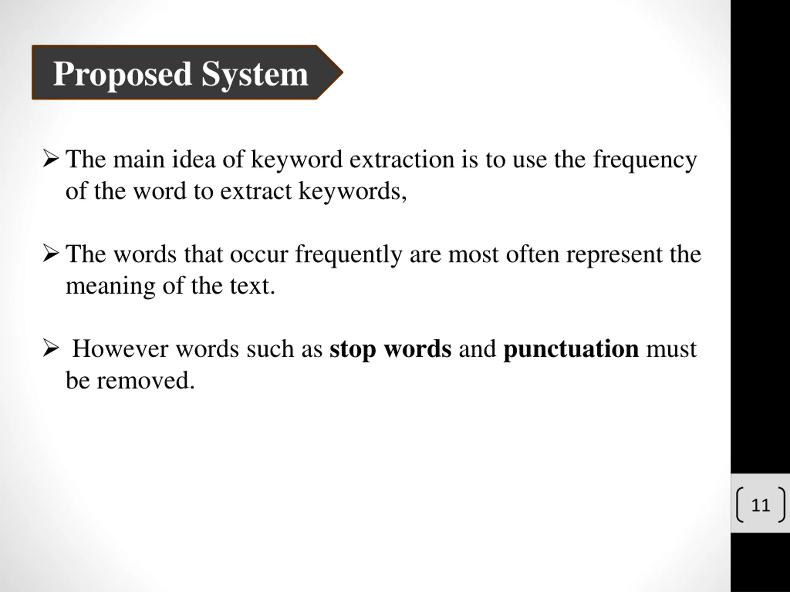 Proposed System The main idea of keyword extraction is to use the frequency of the word to extract keywords, The words that occur frequently are most often represent the meaning of the text. However words such as stop words and punctuation must be removed. 11