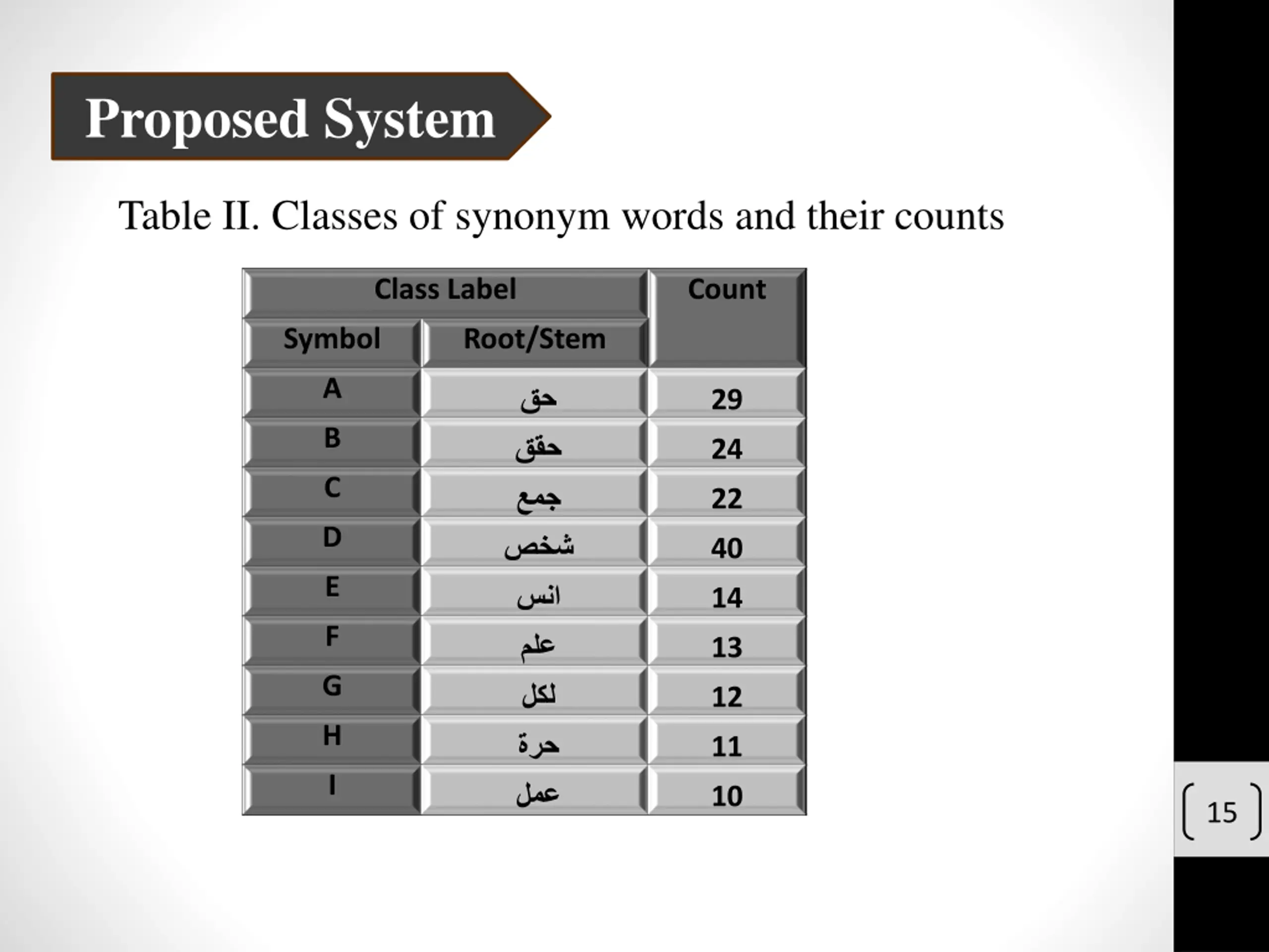 Proposed System Table II. Classes of synonym words and their counts Class Label Count Symbol Root/Stem A 29 B 24 C 22 D 40 E 14 F 13 G 12 H 11 I 10 15