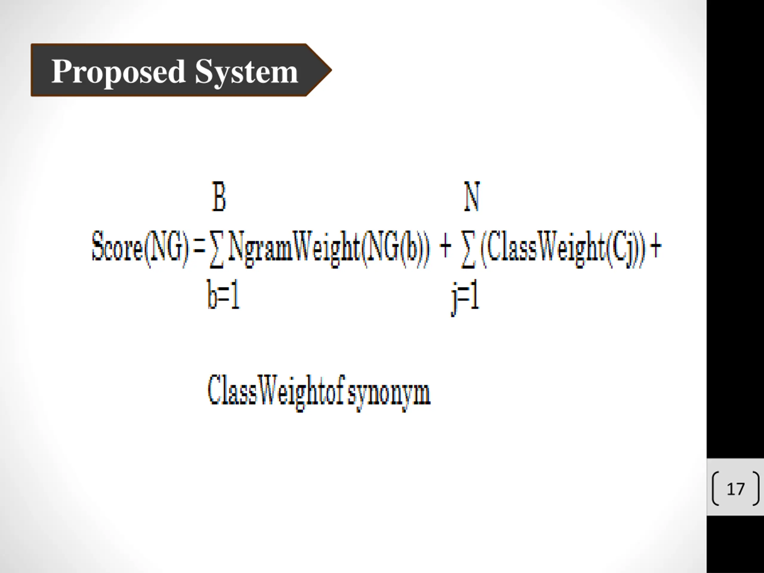 Proposed System Table II. Classes of synonym words and their counts Class Label Count Symbol Root/Stem A 29 B 24 C 22 D 40 E 14 F 13 G 12 H 11 I 10 16