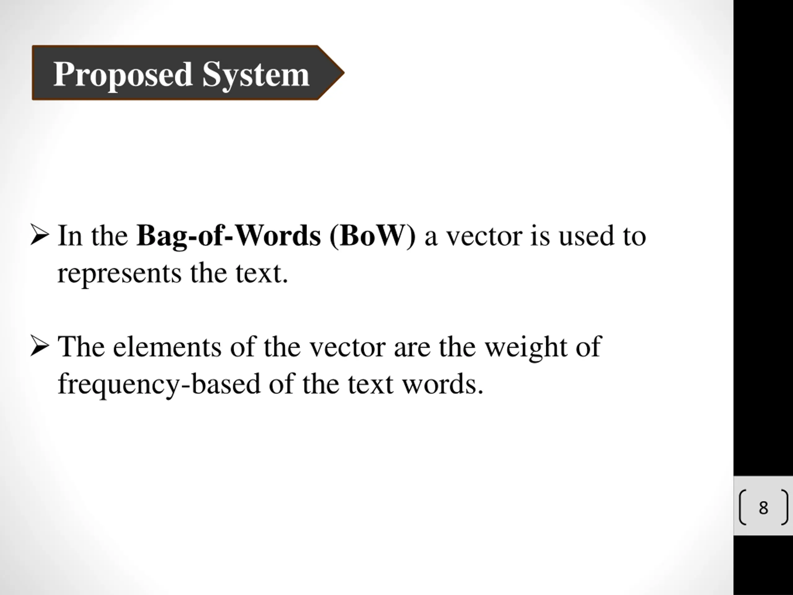 Proposed System In the Bag-of-Words (BoW) a vector is used to represents the text. The elements of the vector are the weight of frequency-based of the text words. 8