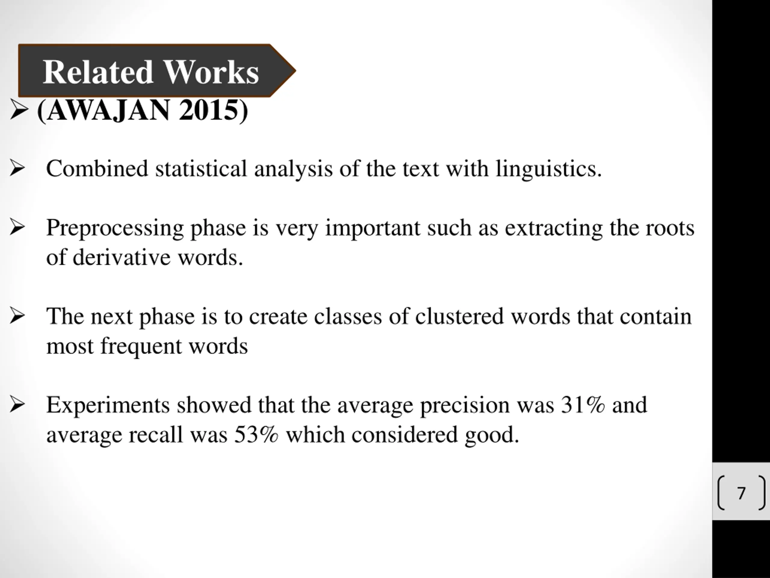 Related Works (AWAJAN 2015) Combined statistical analysis of the text with linguistics. Preprocessing phase is very important such as extracting the roots of derivative words. The next phase is to create classes of clustered words that contain most frequent words Experiments showed that the average precision was 31% and average recall was 53% which considered good. 7