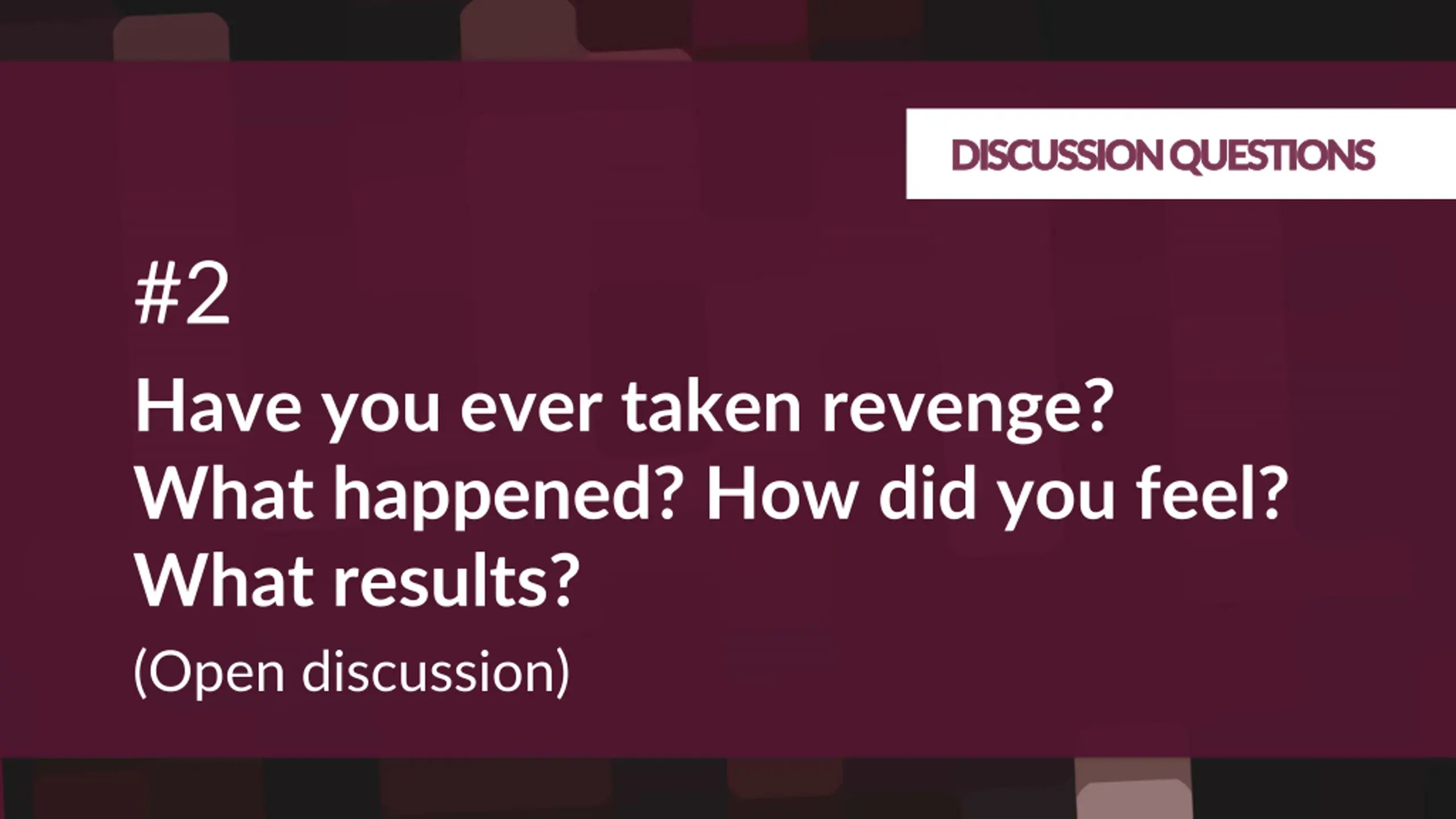 DISCUSSION QUESTIONS DISCUSSION QUESTIONS #2 Have you ever taken revenge? What happened? How did you feel? What results? (Open discussion)