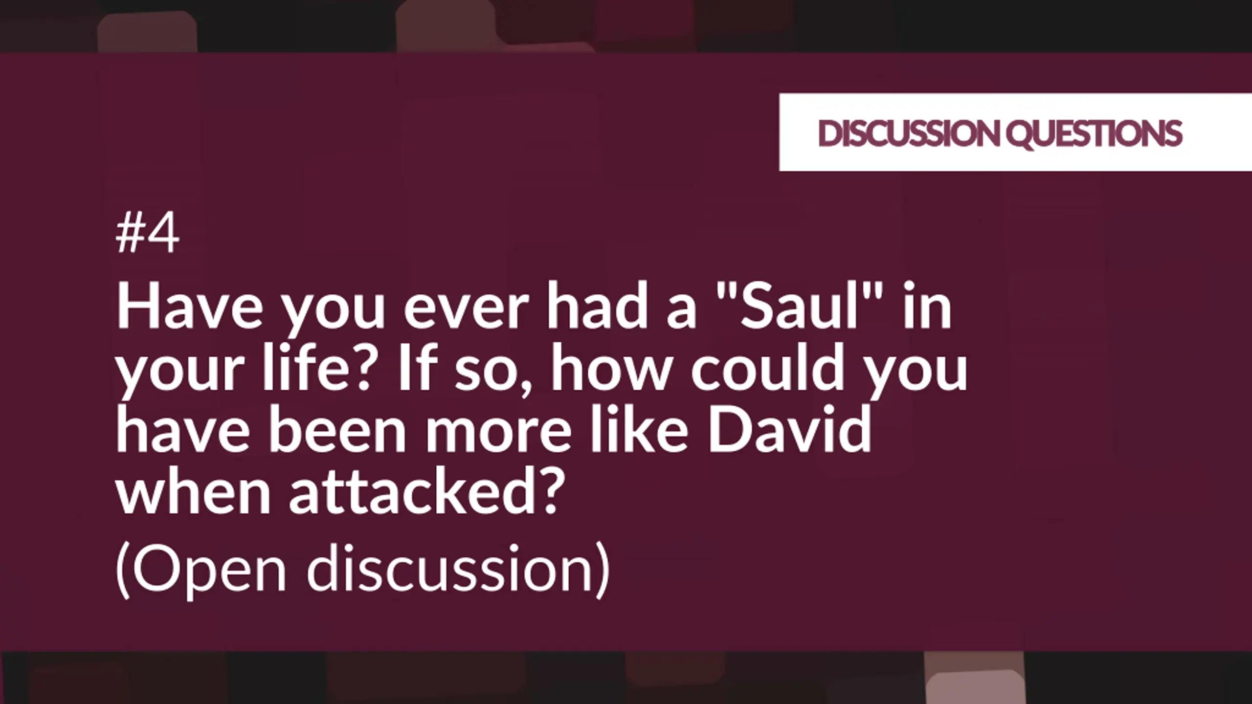 DISCUSSION QUESTIONS DISCUSSION QUESTIONS #4 Have you ever had a "Saul" in your life? If so, how could you have been more like David when attacked? (Open discussion)