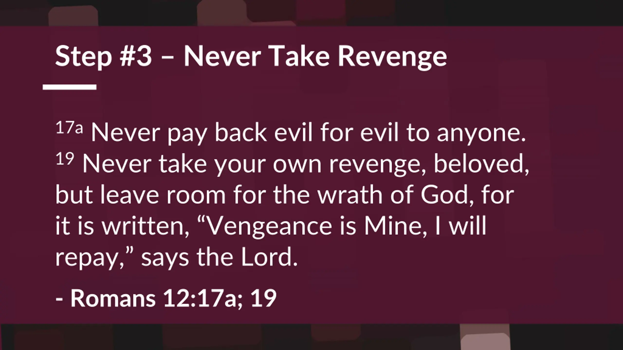Step #3 Never Take Revenge 17aNever pay back evil for evil to anyone. 19Never take your own revenge, beloved, but leave room for the wrath of God, for it is written, Vengeance is Mine, I will repay, says the Lord. - Romans 12:17a; 19