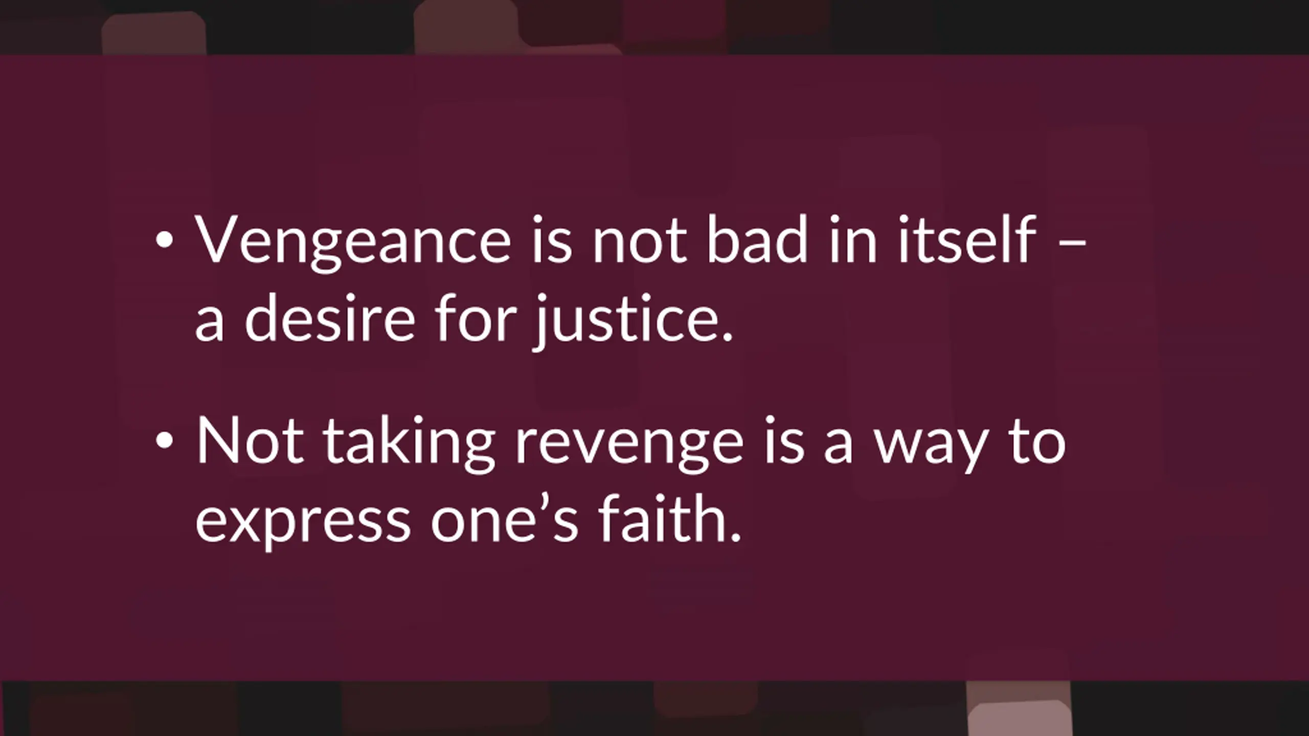 Vengeance is not bad in itself a desire for justice. Not taking revenge is a way to express one s faith.