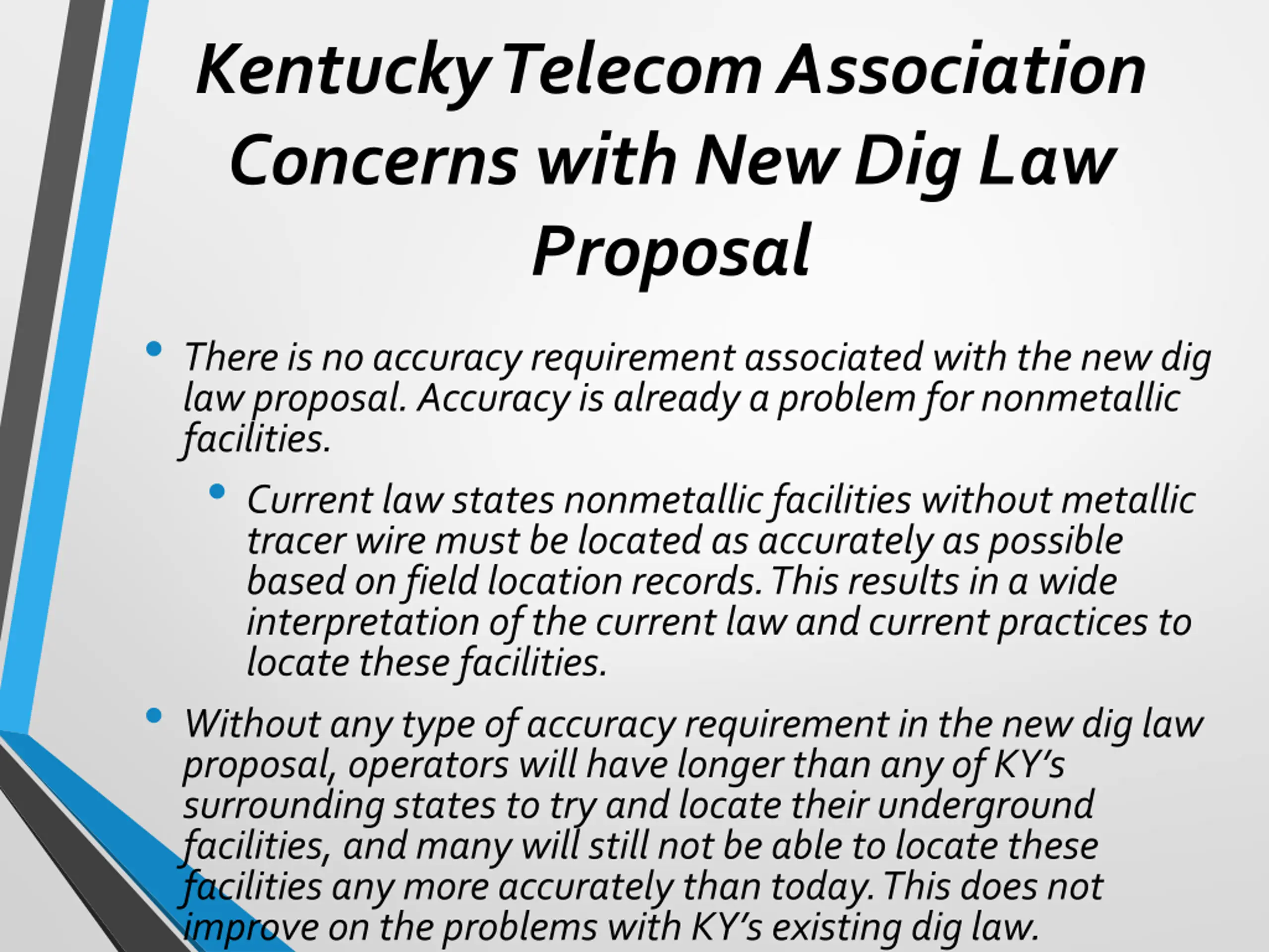 Kentucky Telecom Association Concerns with New Dig Law Proposal There is no accuracy requirement associated with the new dig law proposal. Accuracy is already a problem for nonmetallic facilities. Current law states nonmetallic facilities without metallic tracer wire must be located as accurately as possible based on field location records. This results in a wide interpretation of the current law and current practices to locate these facilities. Without any type of accuracy requirement in the new dig law proposal, operators will have longer than any of KY s surrounding states to try and locate their underground facilities, and many will still not be able to locate these facilities any more accurately than today. This does not improve on the problems with KY s existing dig law.