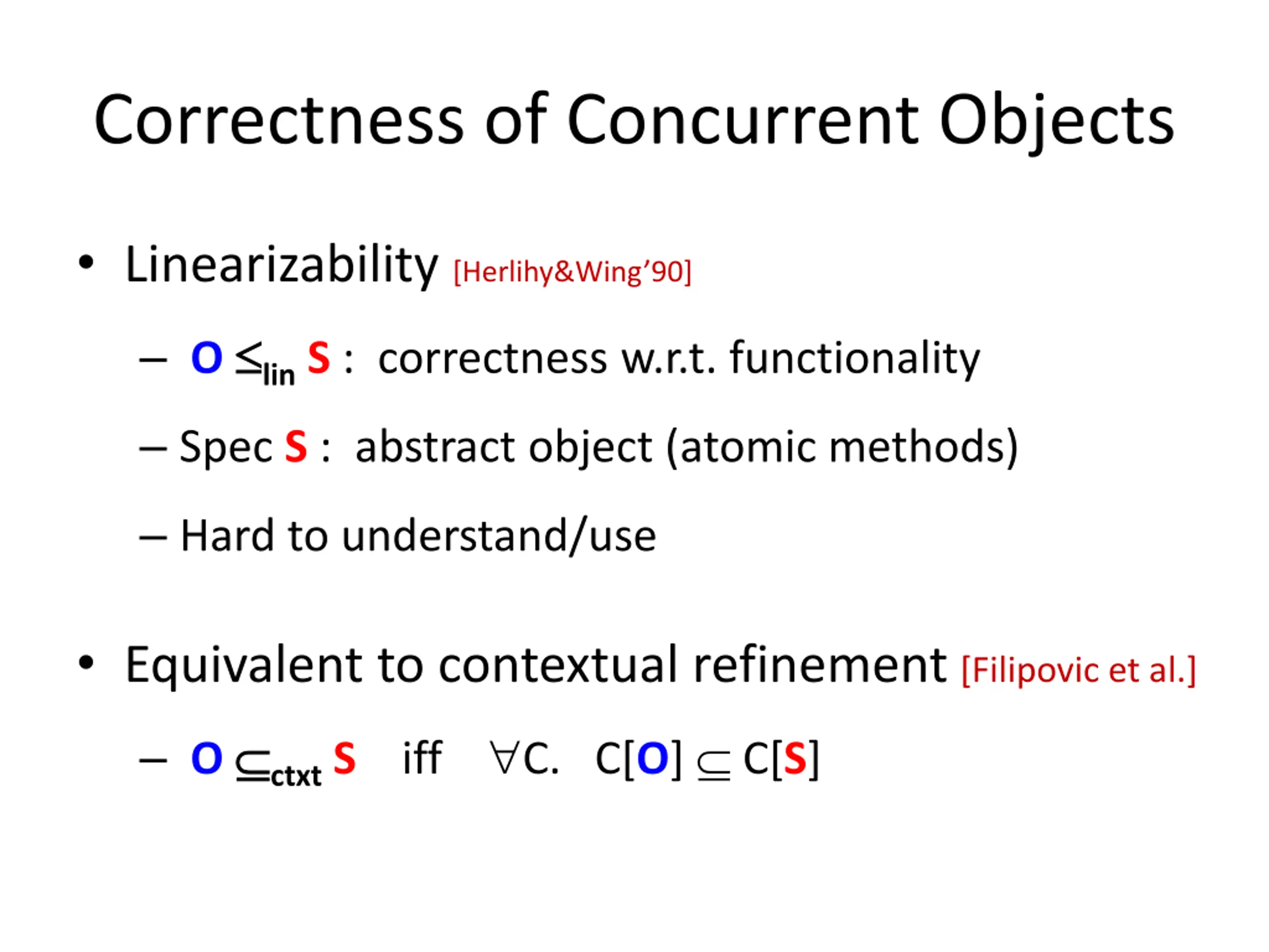 Correctness of Concurrent Objects Linearizability [Herlihy&Wing 90] O linS : correctness w.r.t. functionality Spec S : abstract object (atomic methods) Hard to understand/use Equivalent to contextual refinement [Filipovic et al.] O ctxtS C. C[O] C[S] iff