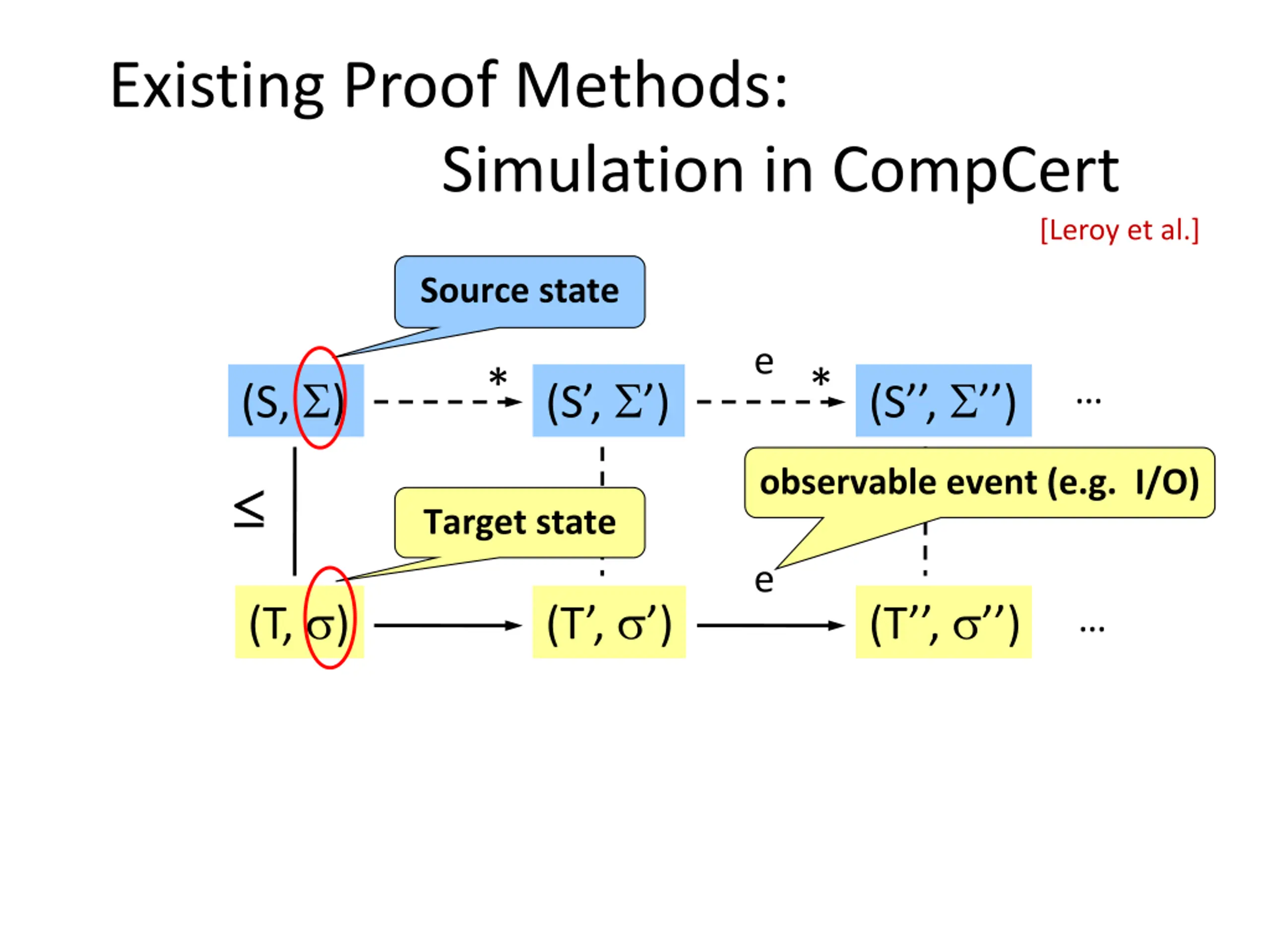 Existing Proof Methods: Simulation in CompCert [Leroy et al.] Source state e* * (S, ) (S , ) (S , ) observable event (e.g. I/O) Target state e (T, ) (T , ) (T , )