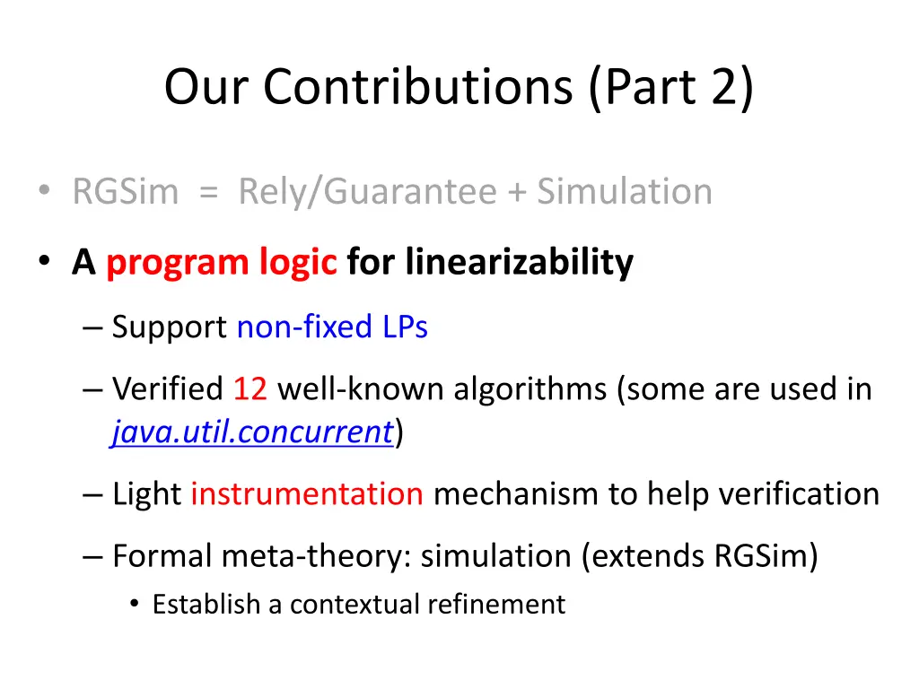 Our Contributions (Part 2) RGSim = Rely/Guarantee + Simulation A program logic for linearizability Support non-fixed LPs Verified 12 well-known algorithms (some are used in java.util.concurrent) Light instrumentation mechanism to help verification Formal meta-theory: simulation (extends RGSim) Establish a contextual refinement