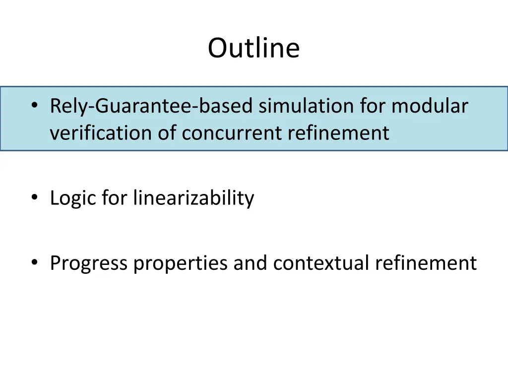 Outline Rely-Guarantee-based simulation for modular verification of concurrent refinement Logic for linearizability Progress properties and contextual refinement