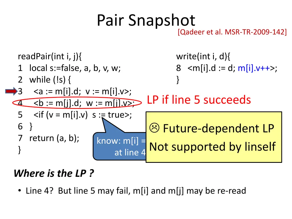 Pair Snapshot [Qadeer et al. MSR-TR-2009-142] readPair(int i, j){ 1 local s:=false, a, b, v, w; 2 while (!s) { 3 <a := m[i].d; v := m[i].v>; 4 <b := m[j].d; w := m[j].v>; 5 <if (v = m[i].v) s := true>; 6 } 7 return (a, b); } write(int i, d){ 8 <m[i].d := d; m[i].v++>; } LP if line 5 succeeds m 0 1 k Future-dependent LP Not supported by linself d know: m[i] = (a,v) at line 4 v version number Where is the LP ? Line 4? But line 5 may fail, m[i] and m[j] may be re-read