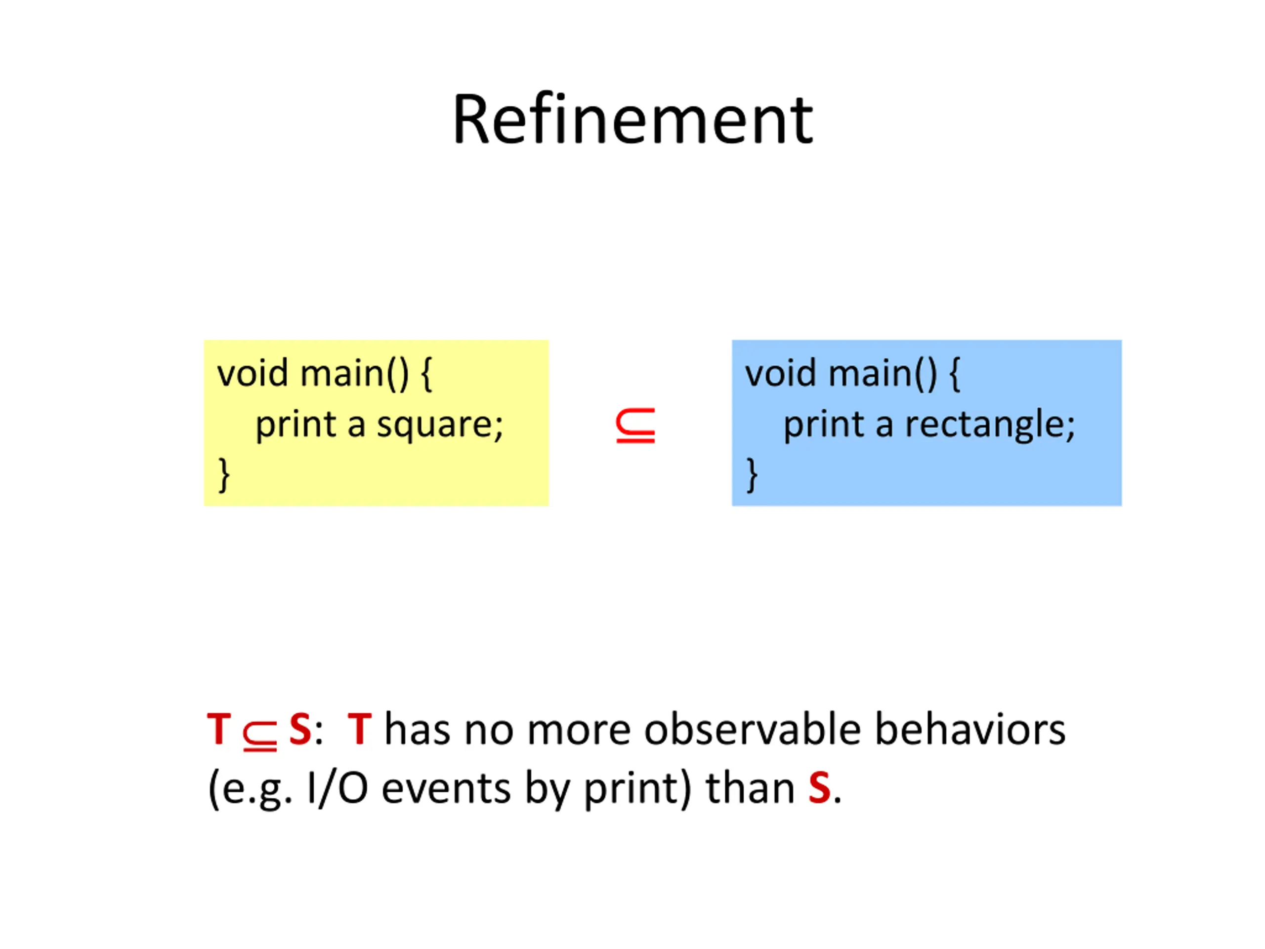 Refinement void main() { print a square; } void main() { print a rectangle; } T S: T has no more observable behaviors (e.g. I/O events by print) than S.