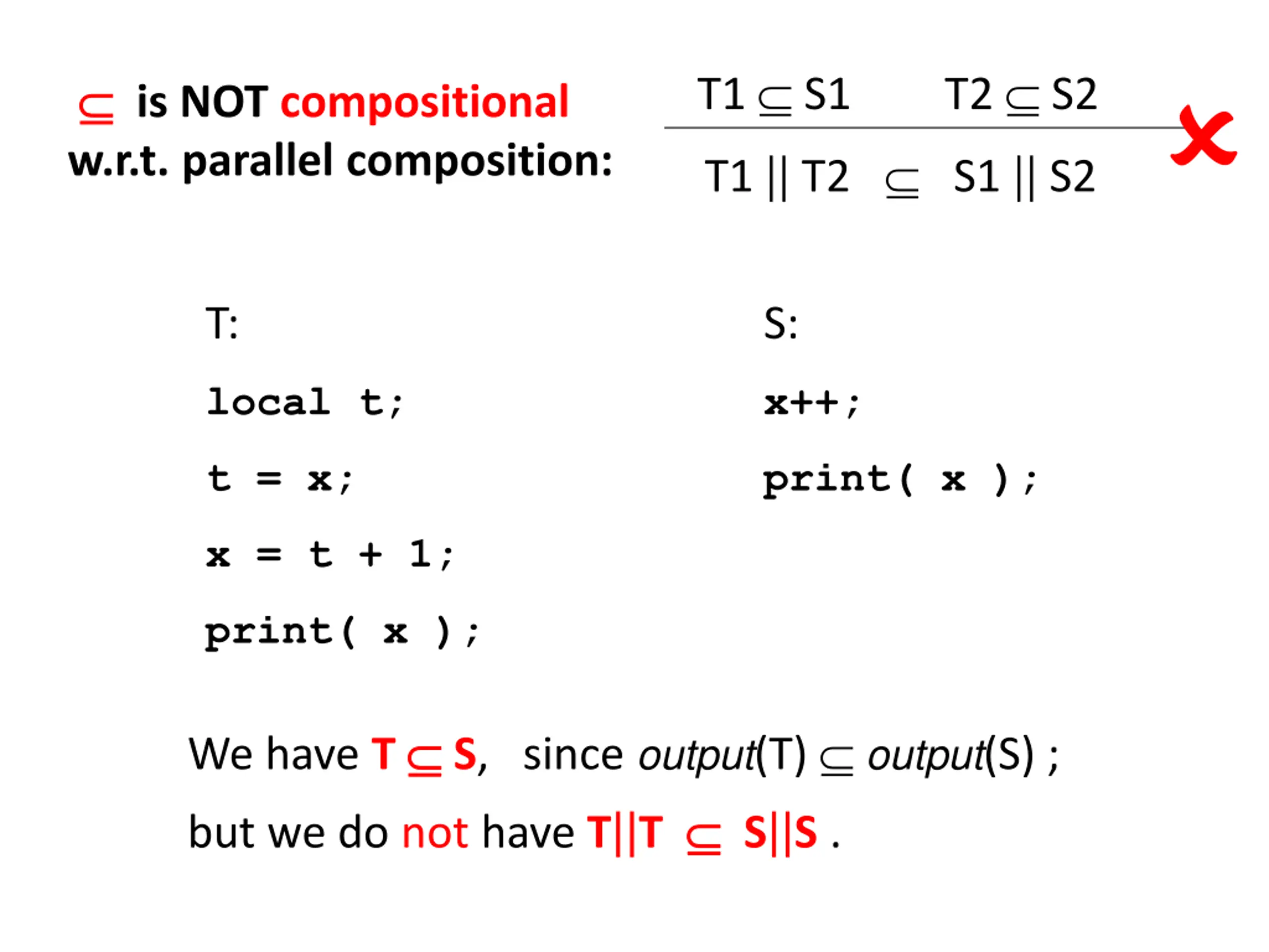 T1 S1 T1 || T2 S1 || S2 T2 S2 is NOT compositional w.r.t. parallel composition: T: S: local t; x++; t = x; print( x ); x = t + 1; print( x ); We have T S, since output(T) output(S) ; but we do not have T||T S||S .