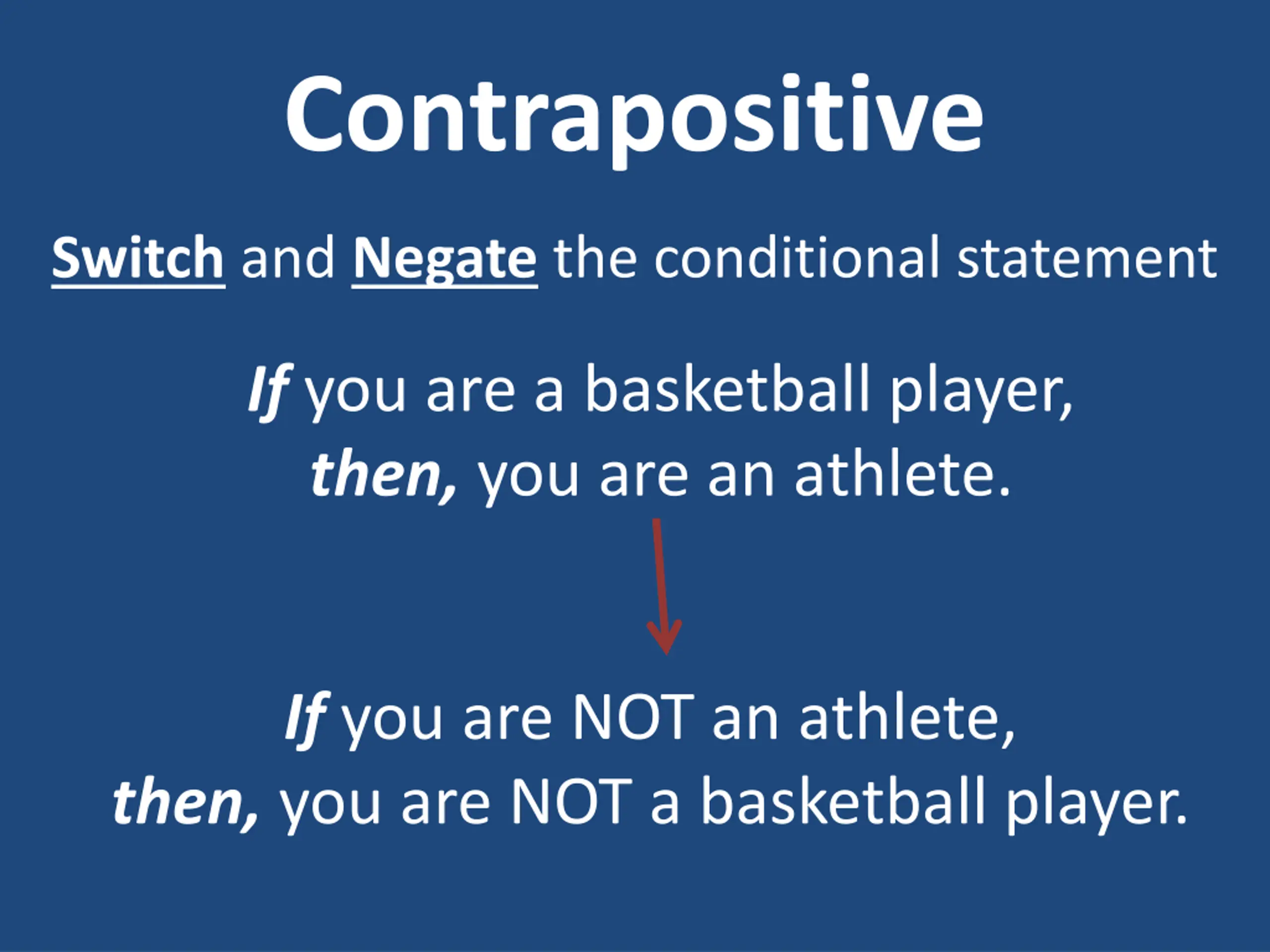 Contrapositive Switch and Negate the conditional statement If you are a basketball player, then, you are an athlete. If you are NOT an athlete, then, you are NOT a basketball player.