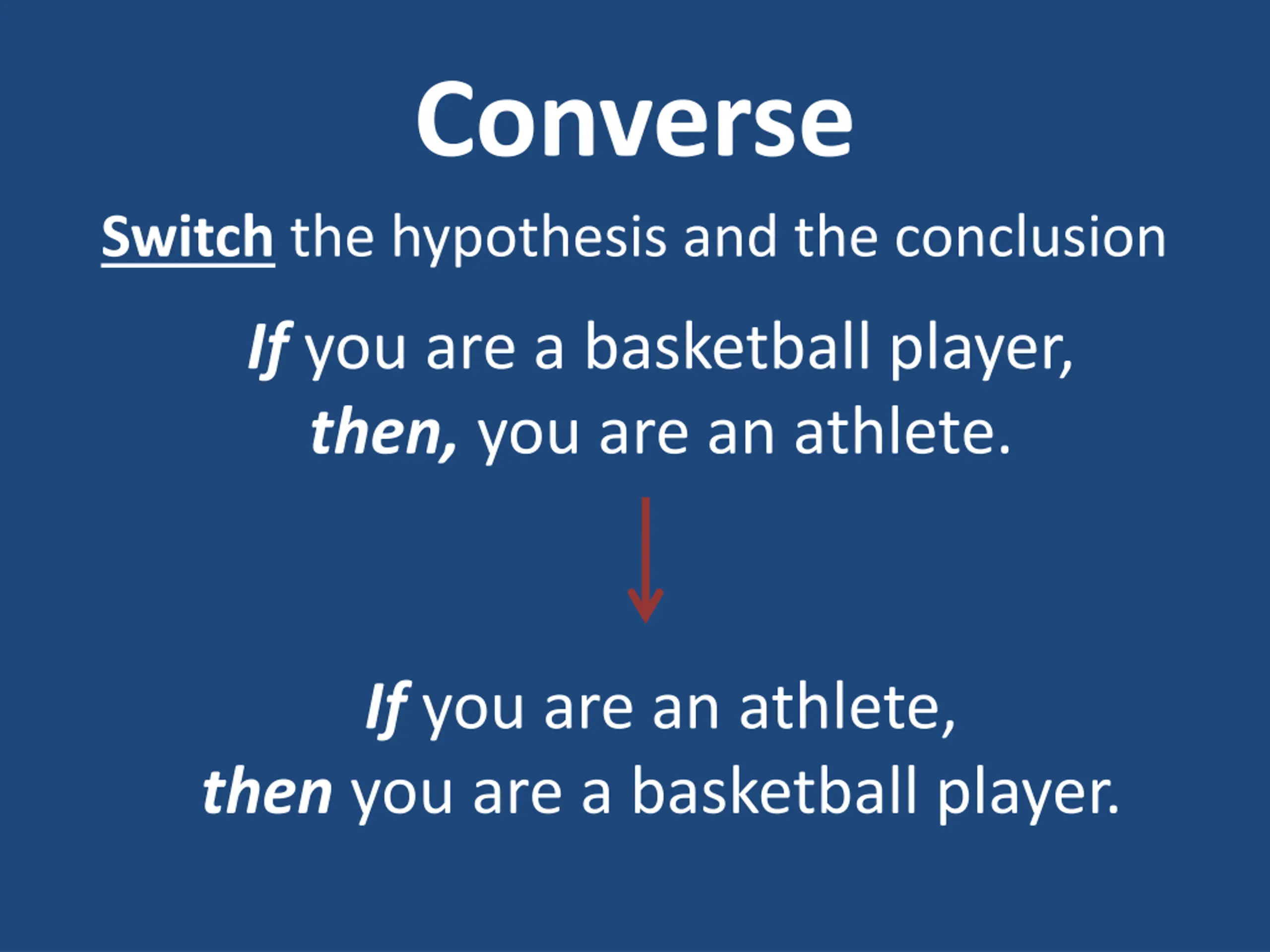 Converse Switch the hypothesis and the conclusion If you are a basketball player, then, you are an athlete. If you are an athlete, then you are a basketball player.