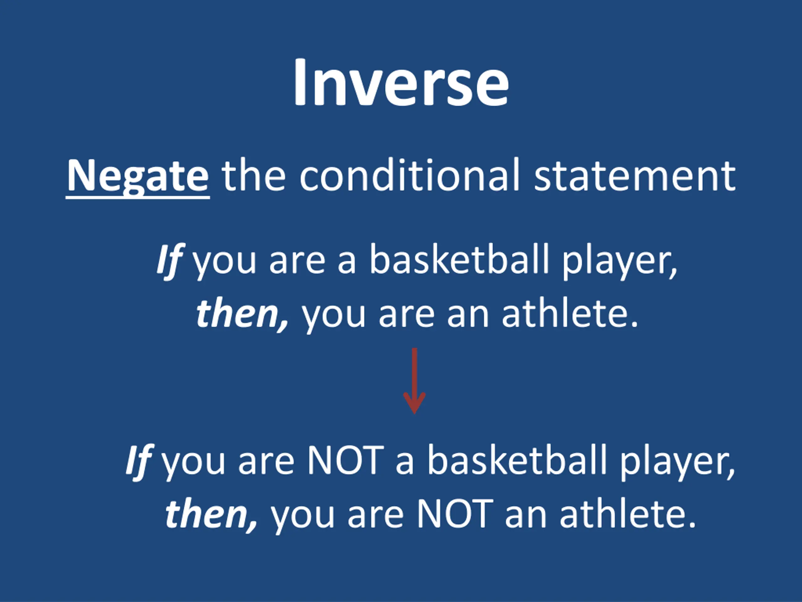 Inverse Negate the conditional statement If you are a basketball player, then, you are an athlete. If you are NOT a basketball player, then, you are NOT an athlete.