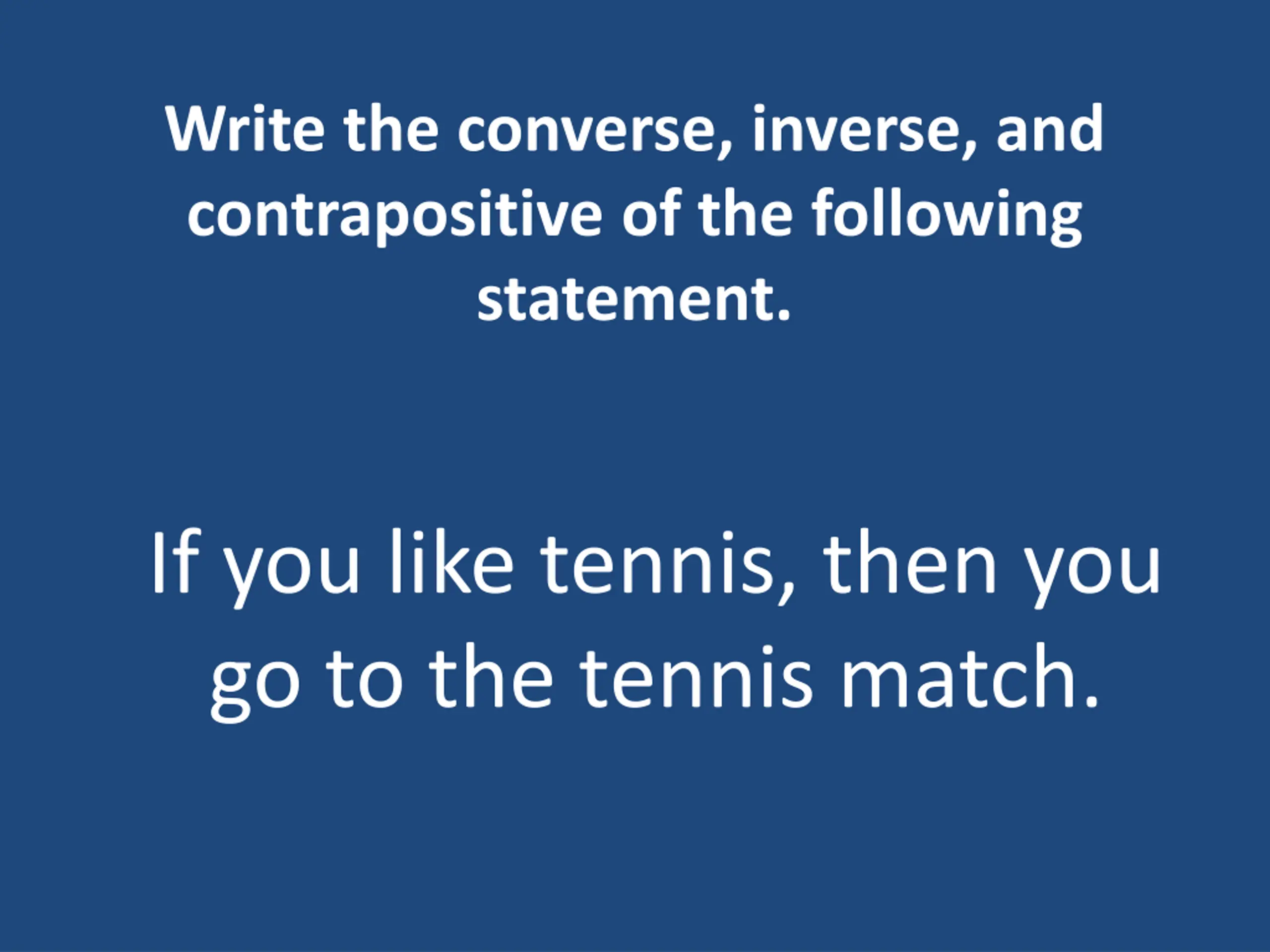 If you like tennis, then you go to the tennis match. Conditional If you go to the tennis match, then you like tennis. Converse If you do not like tennis, then you do not go to the tennis match. Inverse If you do not go to the tennis match, then you do not like tennis. Contrapositive