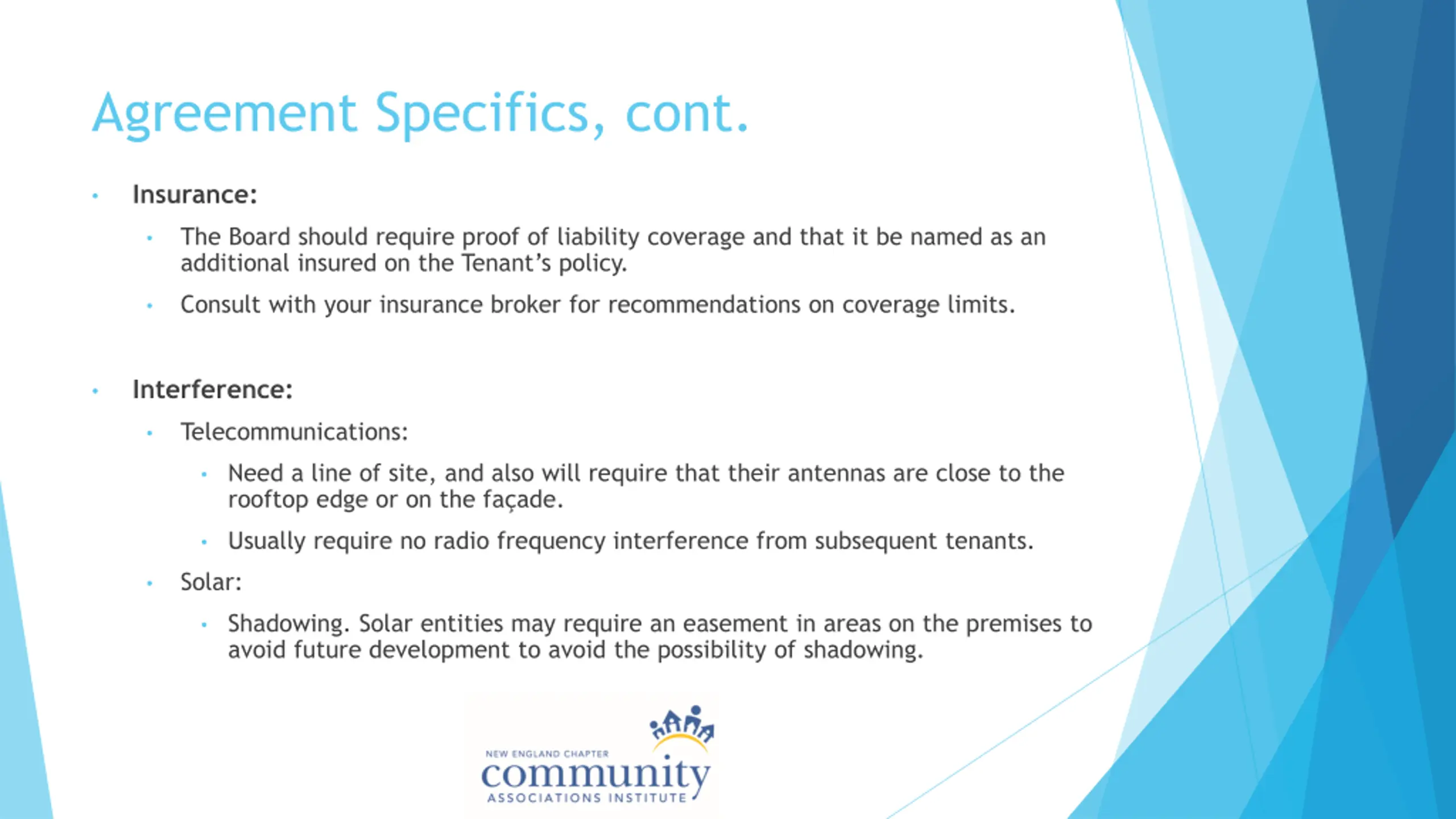 Agreement Specifics, cont. Insurance: The Board should require proof of liability coverage and that it be named as an additional insured on the Tenant s policy. Consult with your insurance broker for recommendations on coverage limits. Interference: Telecommunications: Need a line of site, and also will require that their antennas are close to the rooftop edge or on the fa ade. Usually require no radio frequency interference from subsequent tenants. Solar: Shadowing. Solar entities may require an easement in areas on the premises to avoid future development to avoid the possibility of shadowing.