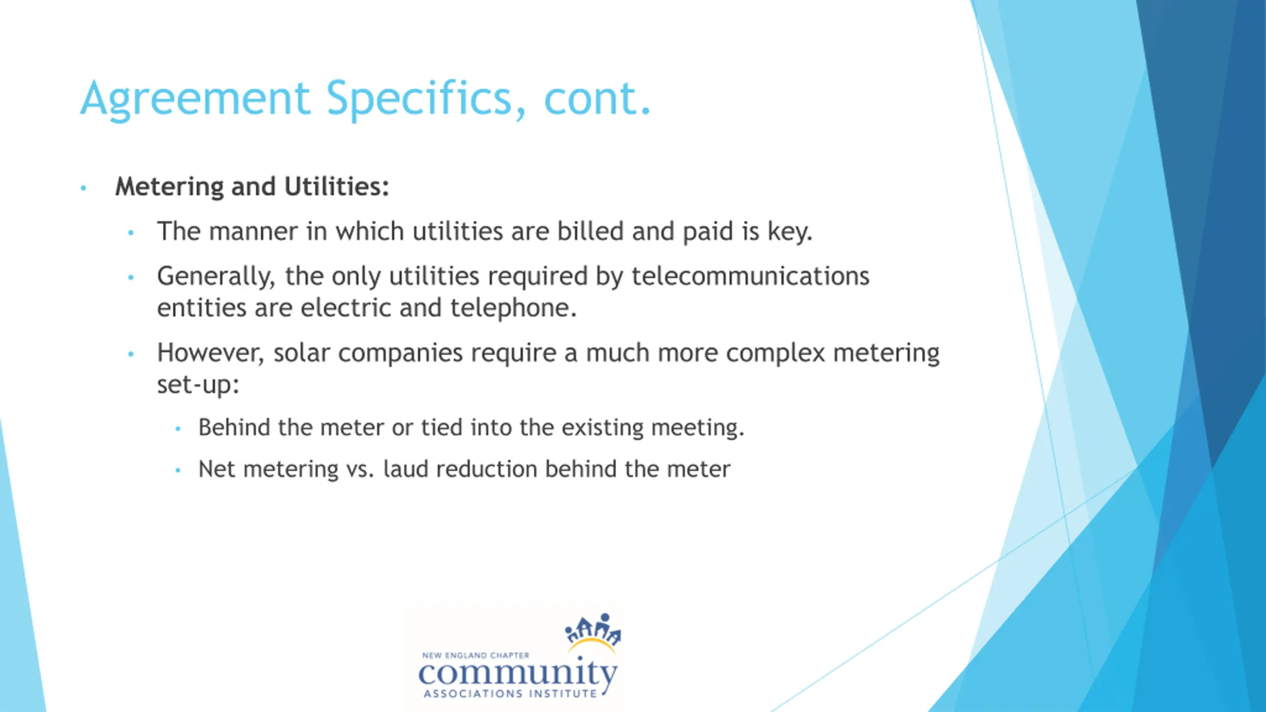 Agreement Specifics, cont. Metering and Utilities: The manner in which utilities are billed and paid is key. Generally, the only utilities required by telecommunications entities are electric and telephone. However, solar companies require a much more complex metering set-up: Behind the meter or tied into the existing meeting. Net metering vs. laud reduction behind the meter