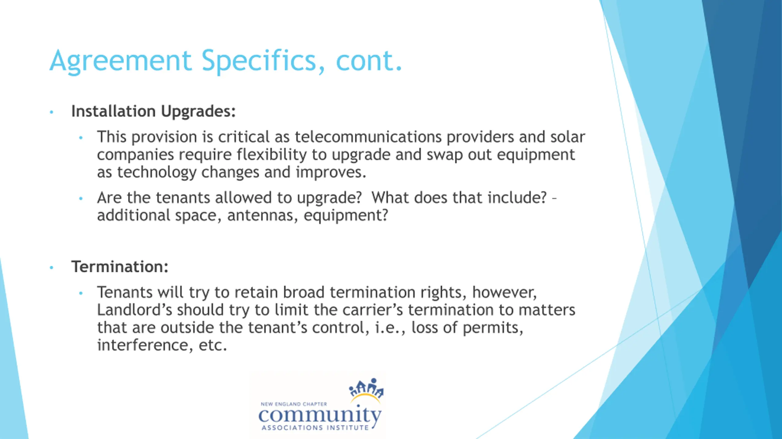 Agreement Specifics, cont. Installation Upgrades: This provision is critical as telecommunications providers and solar companies require flexibility to upgrade and swap out equipment as technology changes and improves. Are the tenants allowed to upgrade? What does that include? additional space, antennas, equipment? Termination: Tenants will try to retain broad termination rights, however, Landlord s should try to limit the carrier s termination to matters that are outside the tenant s control, i.e., loss of permits, interference, etc.