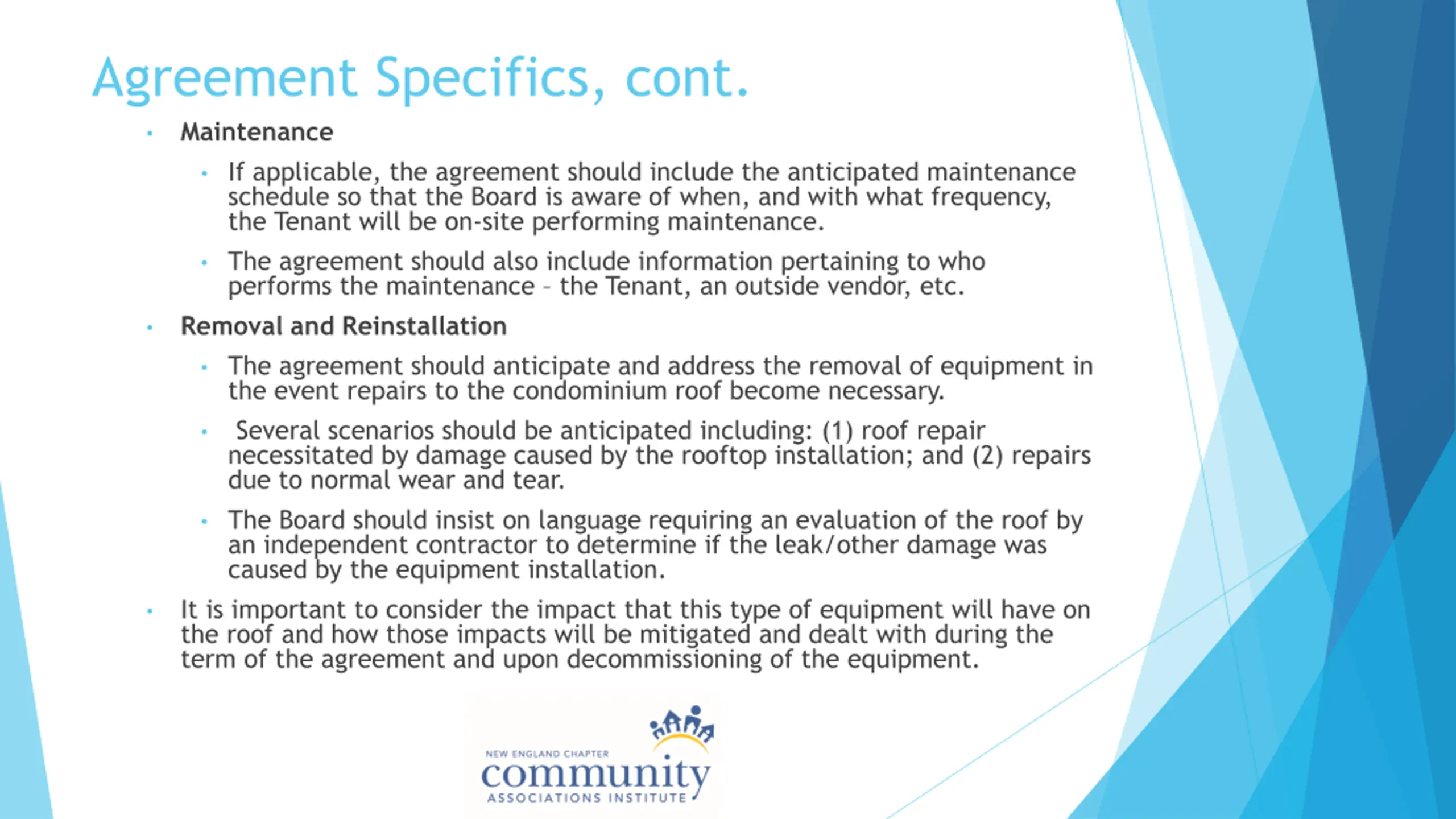 Agreement Specifics, cont. Maintenance If applicable, the agreement should include the anticipated maintenance schedule so that the Board is aware of when, and with what frequency, the Tenant will be on-site performing maintenance. The agreement should also include information pertaining to who performs the maintenance the Tenant, an outside vendor, etc. Removal and Reinstallation The agreement should anticipate and address the removal of equipment in the event repairs to the condominium roof become necessary. Several scenarios should be anticipated including: (1) roof repair necessitated by damage caused by the rooftop installation; and (2) repairs due to normal wear and tear. The Board should insist on language requiring an evaluation of the roof by an independent contractor to determine if the leak/other damage was caused by the equipment installation. It is important to consider the impact that this type of equipment will have on the roof and how those impacts will be mitigated and dealt with during the term of the agreement and upon decommissioning of the equipment.