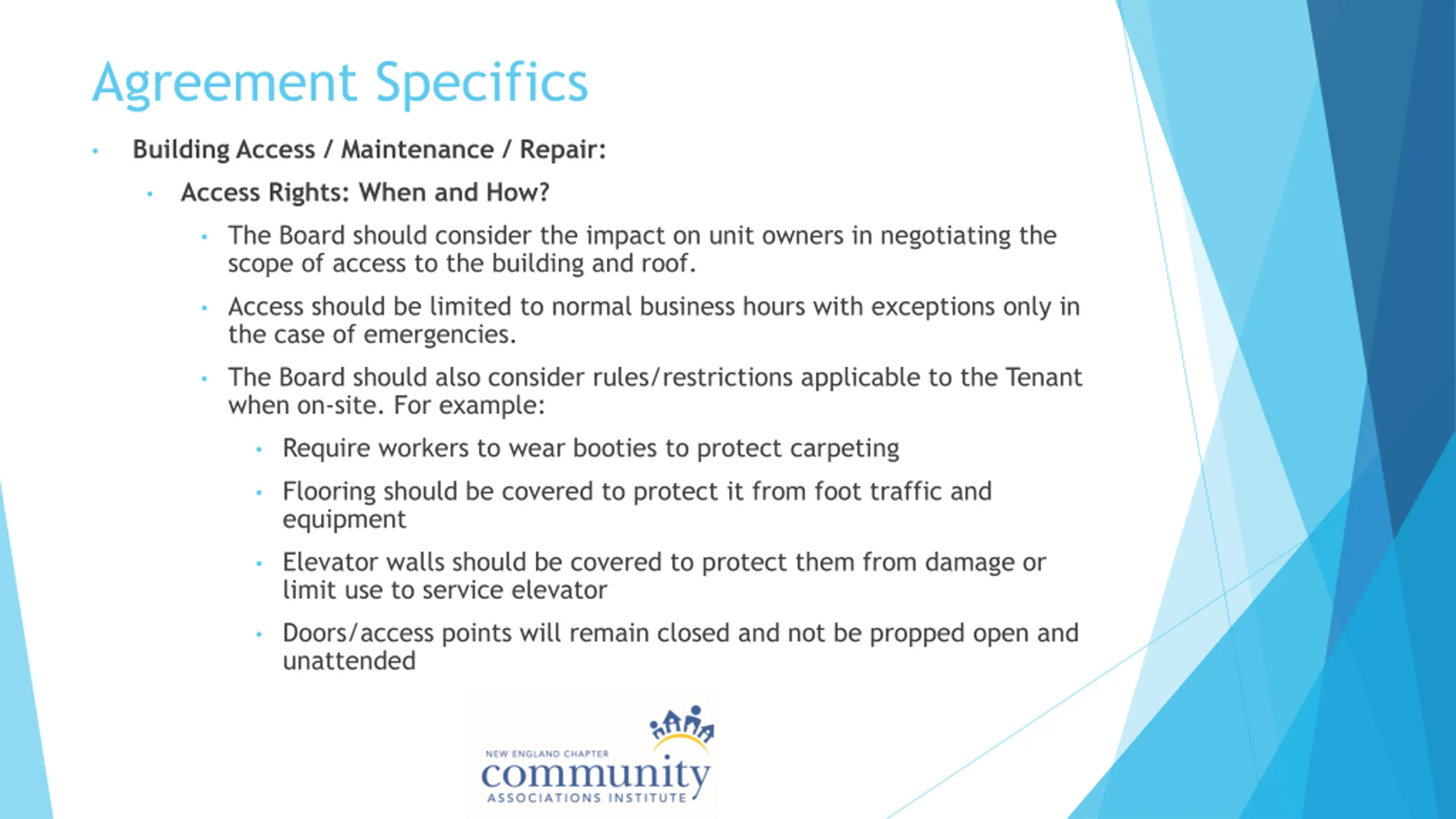 Agreement Specifics Building Access / Maintenance / Repair: Access Rights: When and How? The Board should consider the impact on unit owners in negotiating the scope of access to the building and roof. Access should be limited to normal business hours with exceptions only in the case of emergencies. The Board should also consider rules/restrictions applicable to the Tenant when on-site. For example: Require workers to wear booties to protect carpeting Flooring should be covered to protect it from foot traffic and equipment Elevator walls should be covered to protect them from damage or limit use to service elevator Doors/access points will remain closed and not be propped open and unattended